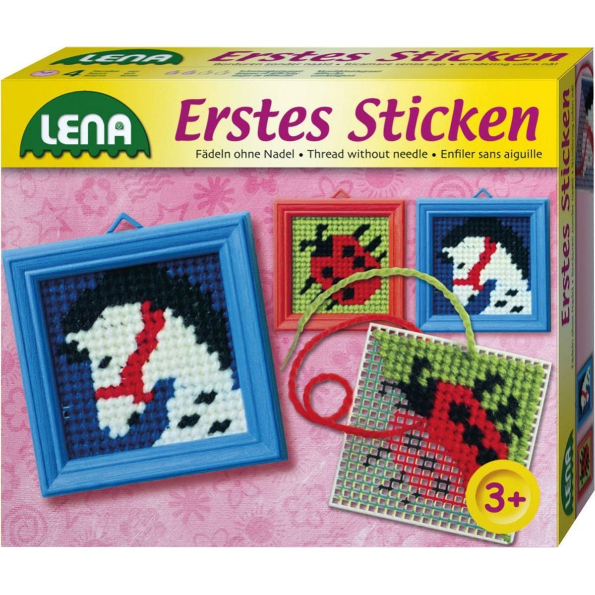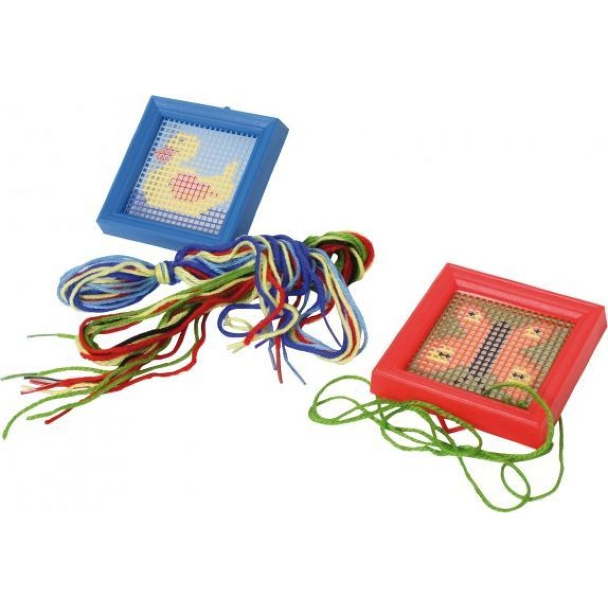 Kompletní sada se dvěmi plastovými mřížkami a potištěním, se kterým si holčičky mohou vyzkoušet vyšít obrázek bez použití jehly. Vyšívat se dá pouze pomocí bavlnky. Činnost je tedy pro holčičky plně bezpečná.
