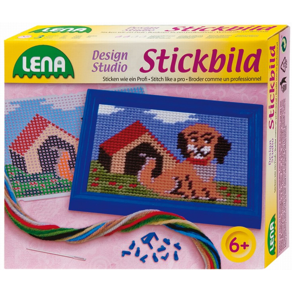 Plastová mřížka v obrázkovém rámu má předtištěný motiv pejska, který mohou děti vyšít barevnými přízemi. Jehla má pro bezpečnost otupělý hrot.