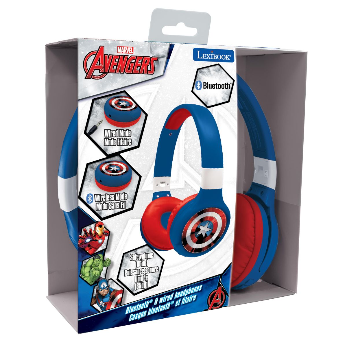 Lexibook 2v1 bluetooth skladacie slúchadlá Avengers sú ideálne pre deti od 4 rokov, ktoré milujú rozprávky aj hudbu. Vďaka obmedzeniu hlasitosti chránia citlivý detský sluch pri počúvaní doma alebo na cestách autom.