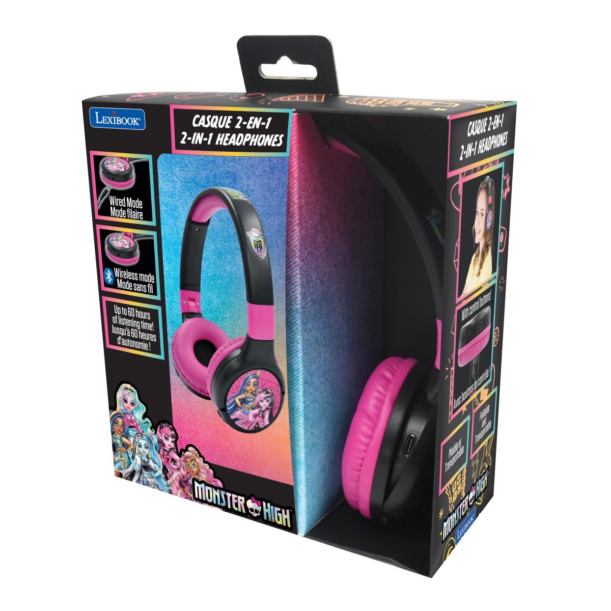Lexibook 2v1 bluetooth skladacie slúchadlá Monster High sú ideálne pre deti od piatich rokov, ktoré radi počúvajú rozprávky, hudbu alebo sa učia. Vďaka limitu hlasitosti je počúvanie bezpečné a príjemné pre detský sluch.