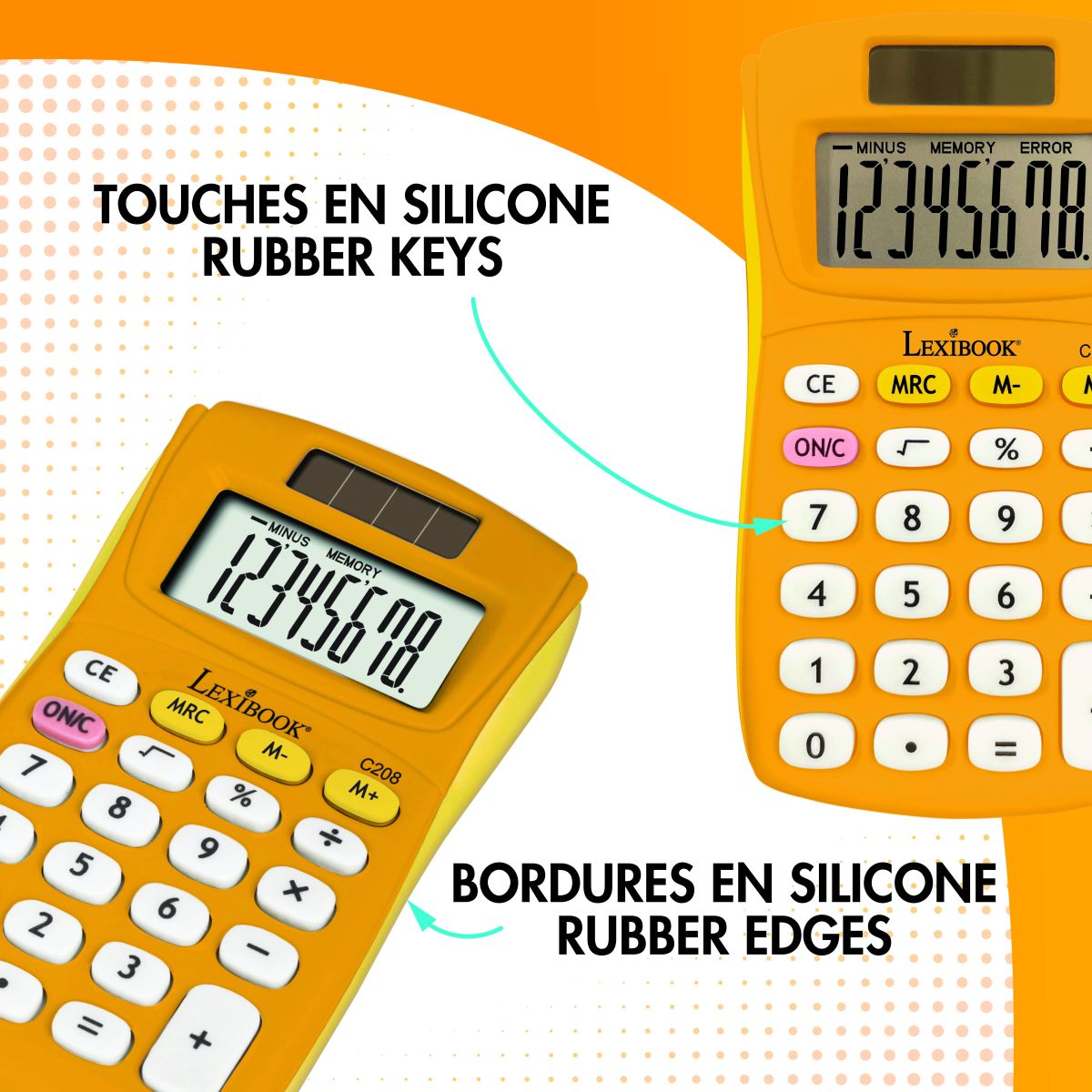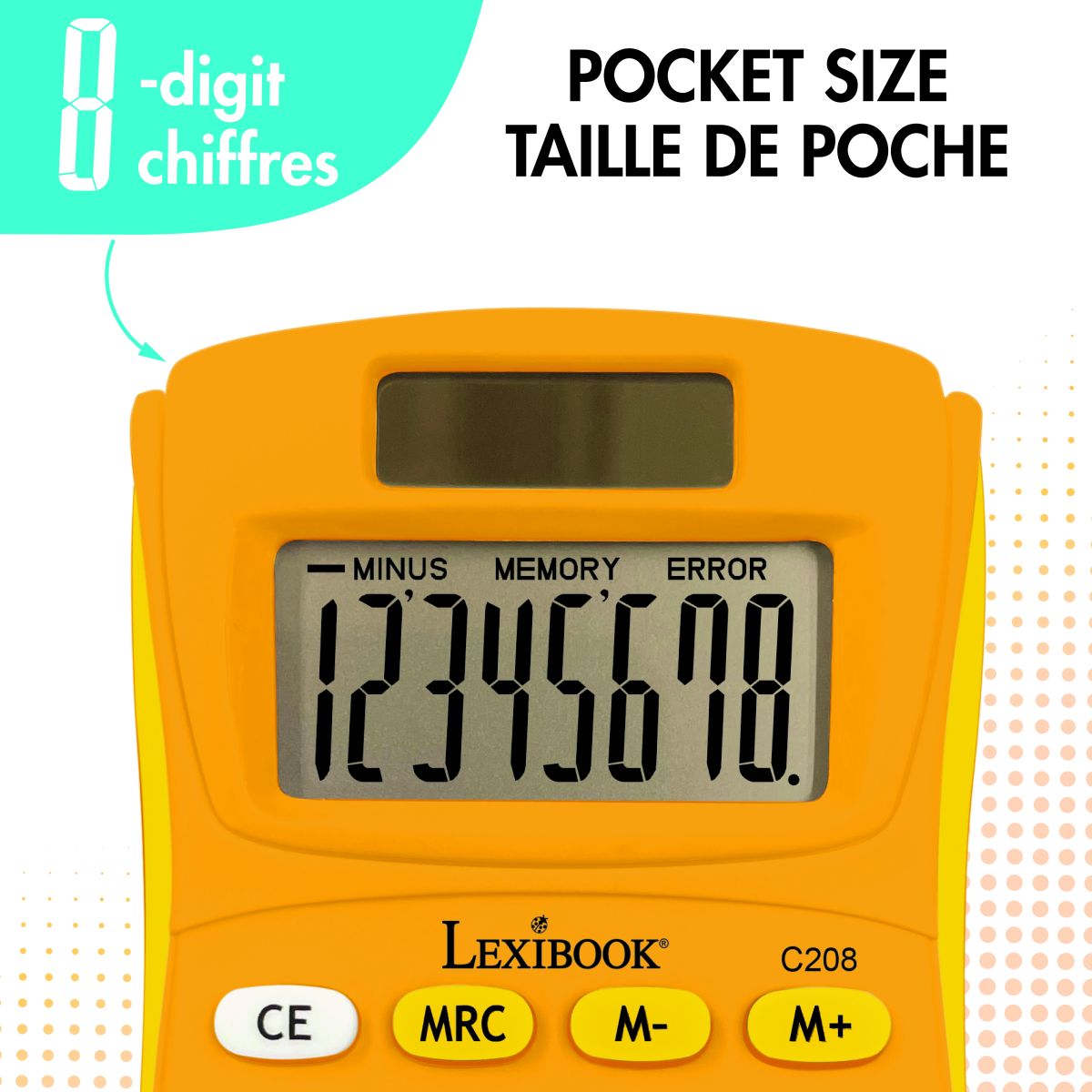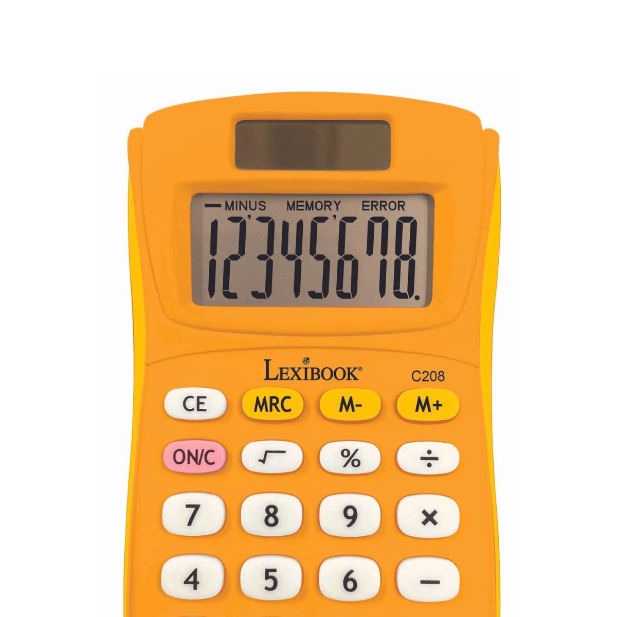 Žltá vrecková kalkulačka Lexibook s gumovým povrchom je praktickým pomocníkom pre deti pri učení sa počítať.