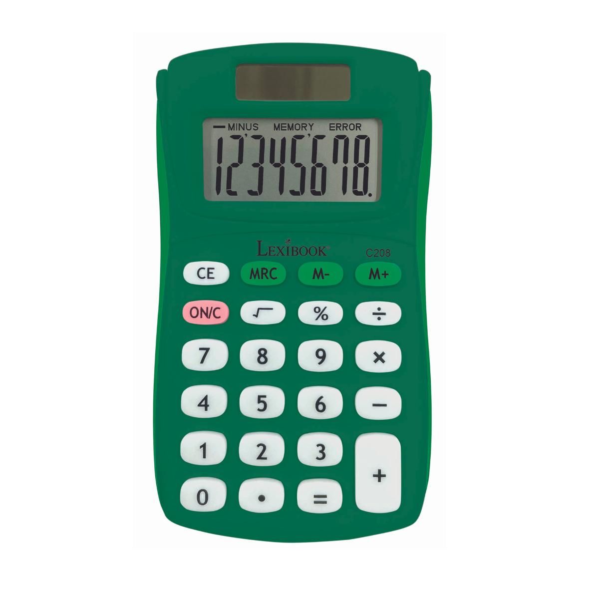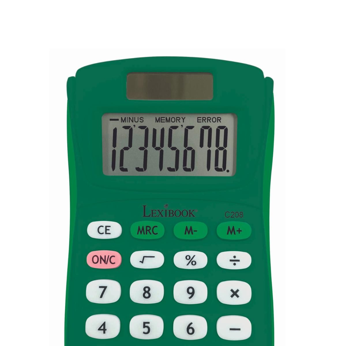 Zelená vrecková kalkulačka Lexibook s ôsmimi miestami na displeji a gumovým povrchom je ideálnym pomocníkom pre malých školákov.