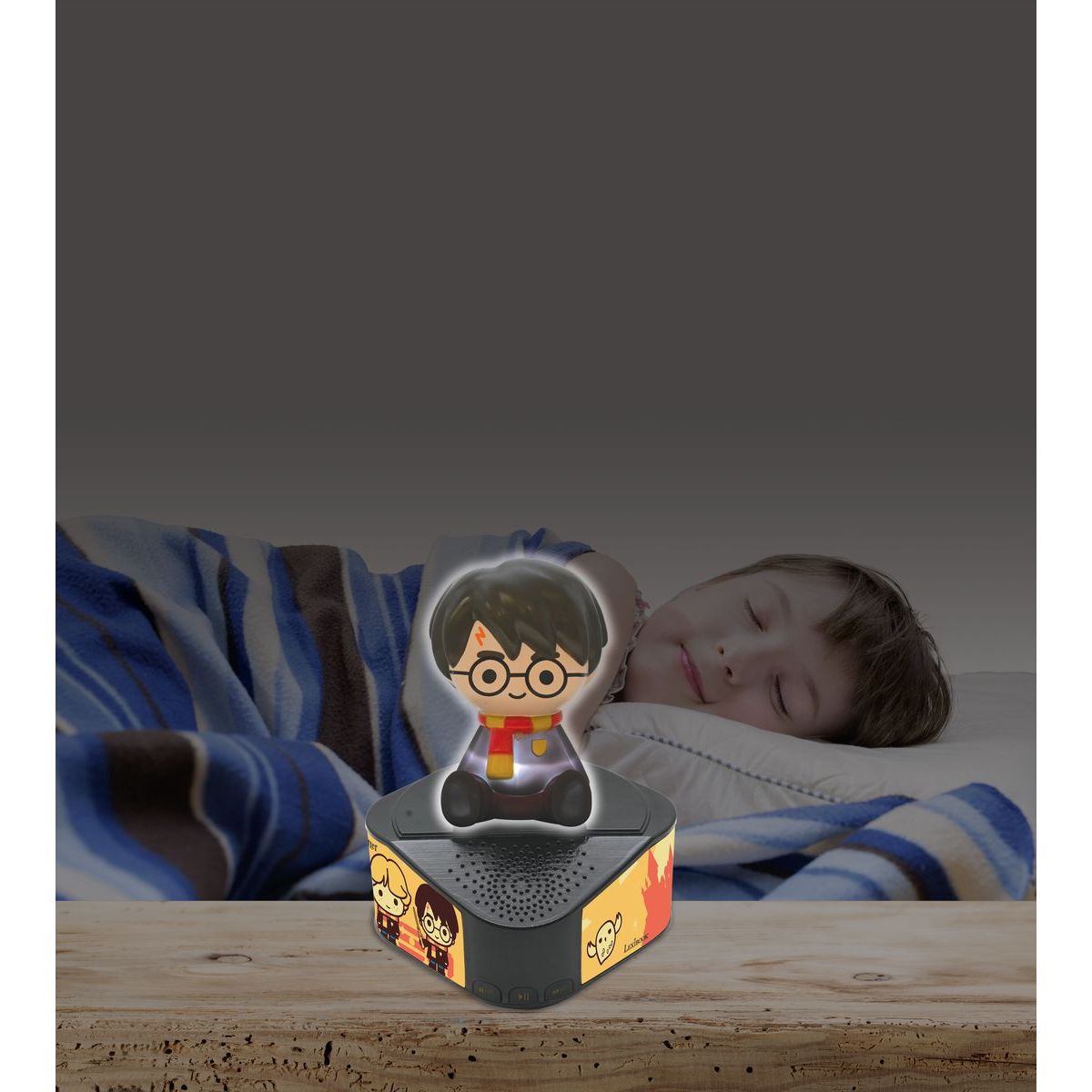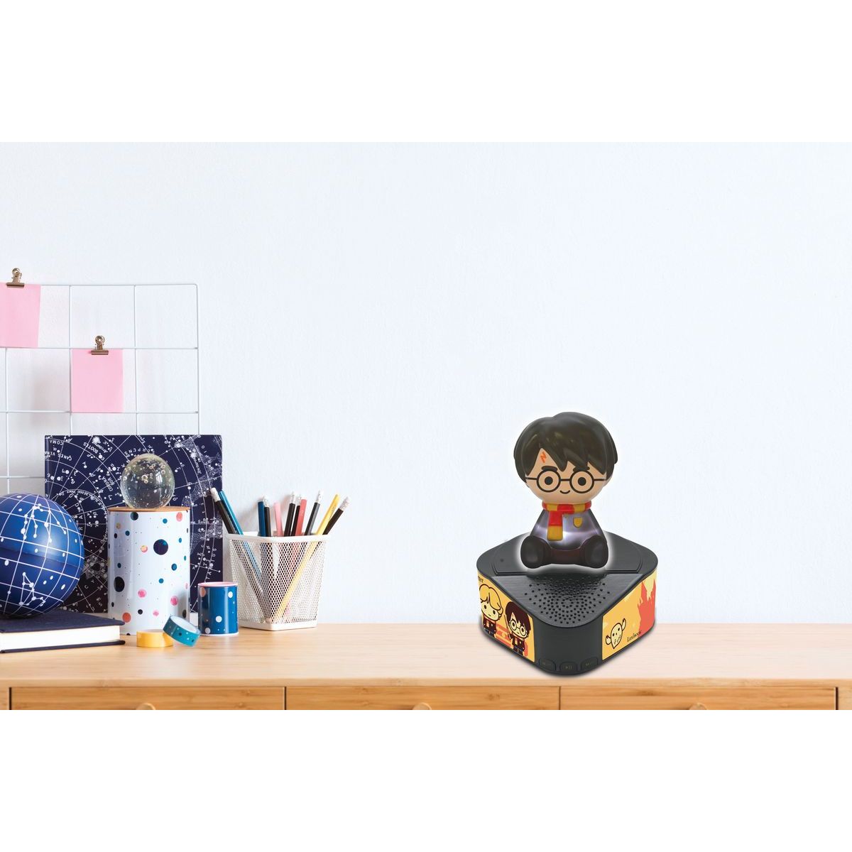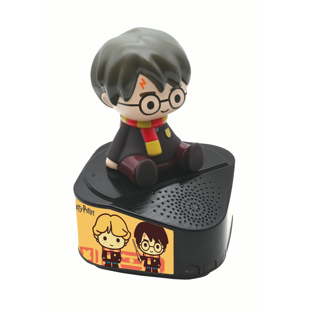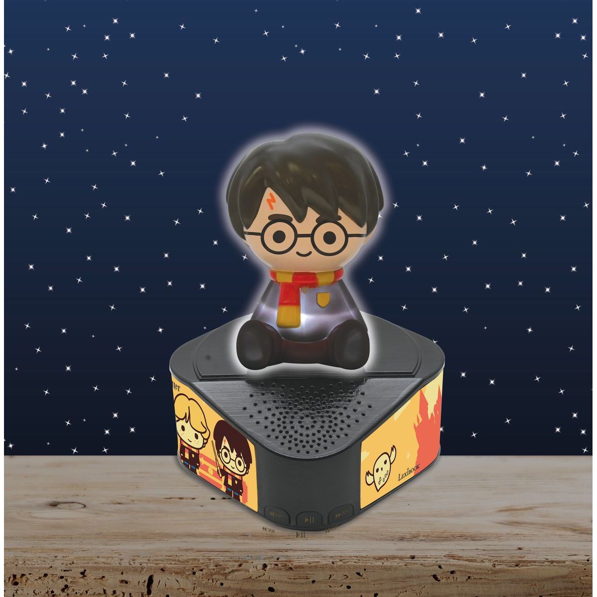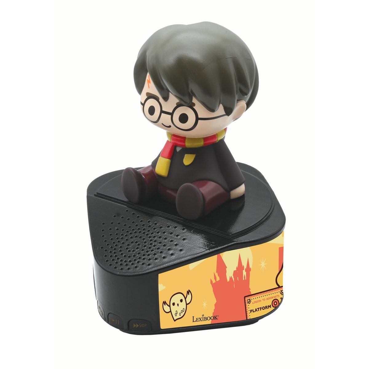 Hudba a čarovná atmosféra v jednom. Bluetooth reproduktor Lexibook so svietiacou figúrkou Harry Potter poteší malých fanúšikov sveta Harry Potter. Na čiernej trojuholníkovej základni s ilustráciami známych postáv stojí figúrka Harryho s ikonickými okrúhlymi okuliarmi, jazvou v tvare blesku a šálom fakulty Chrabromil.