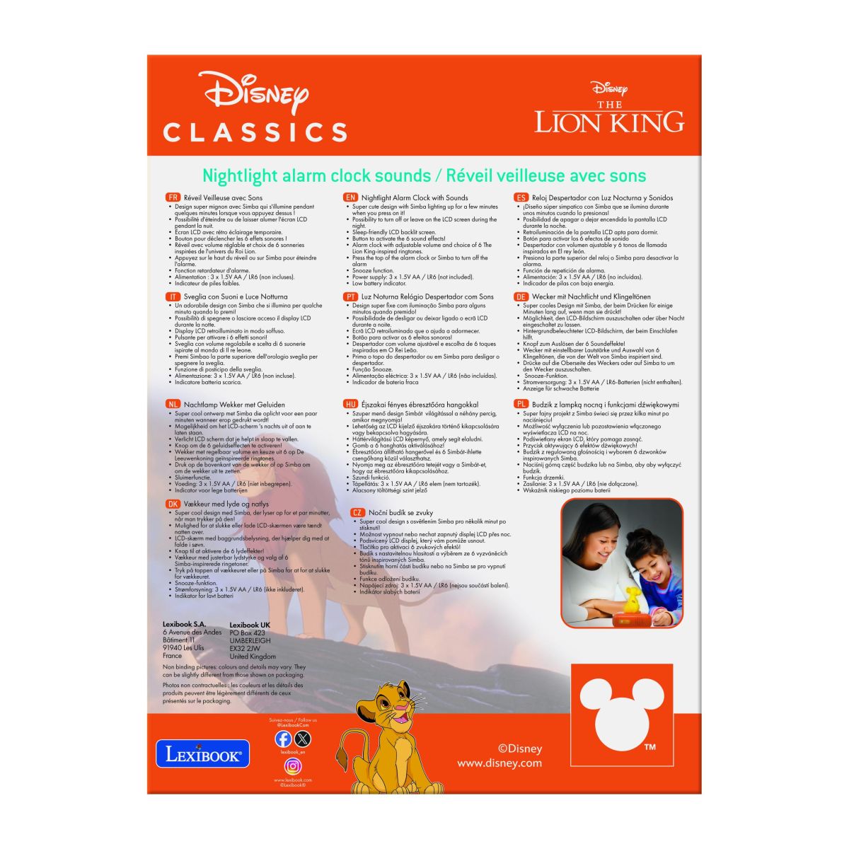 Lexibook budík Simba so svietiacou figúrkou spríjemní deťom ranné vstávanie a zároveň ozdobí detskú izbu. Má prehľadný displej a jednoduché ovládanie, ktoré uľahčia používanie aj menším deťom. Vďaka odolnému prevedeniu je vhodný na každodennú prevádzku a stane sa obľúbeným spoločníkom detských rán.