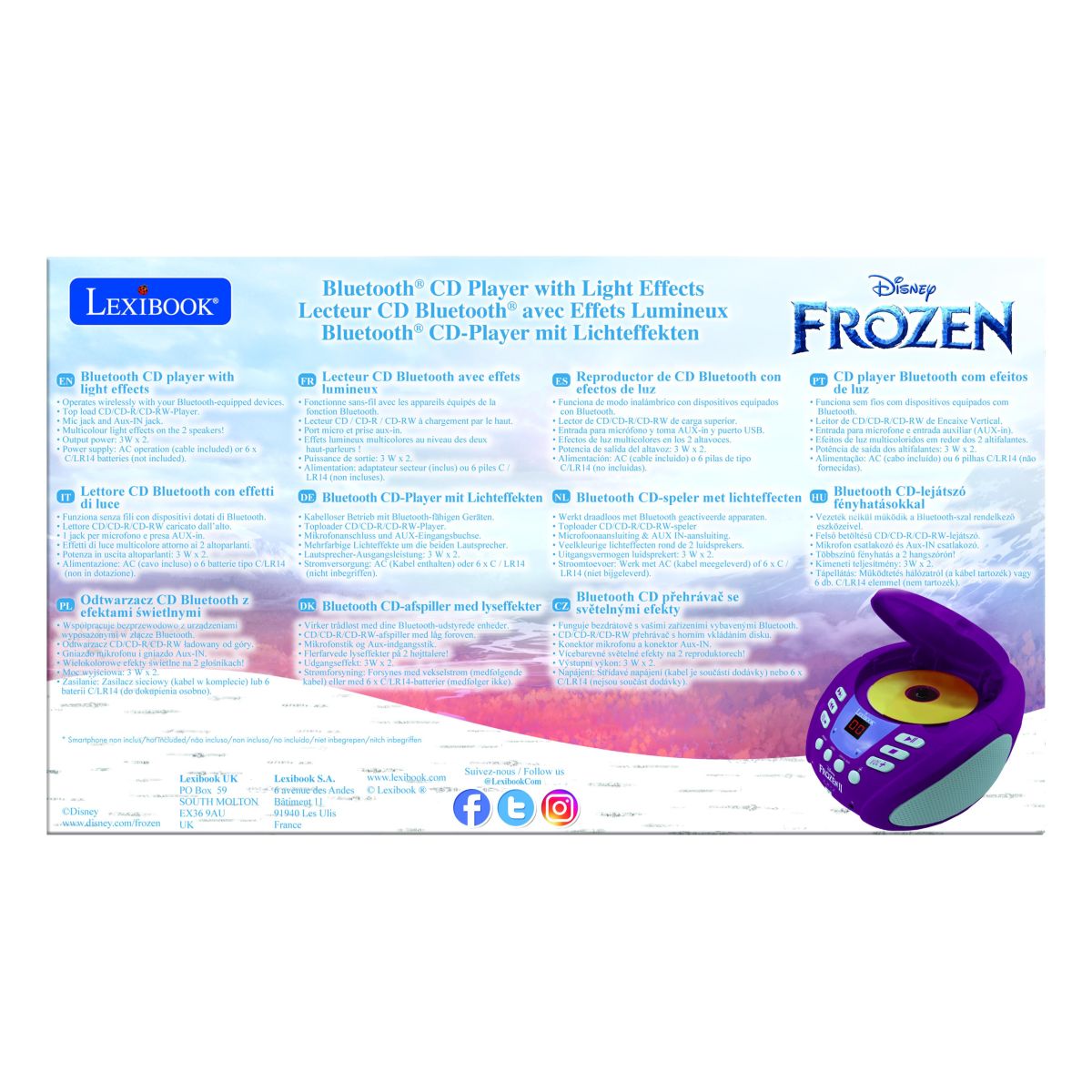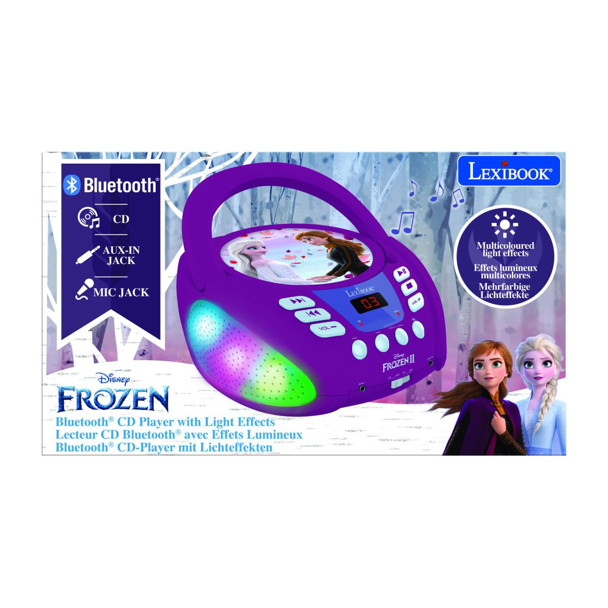 S Lexibook CD prehrávačom Frozen si deti vychutnajú množstvo hudby a zábavy! Prístroj umožňuje jednoduché prehrávanie CD aj pripojenie cez bluetooth k iným zariadeniam.