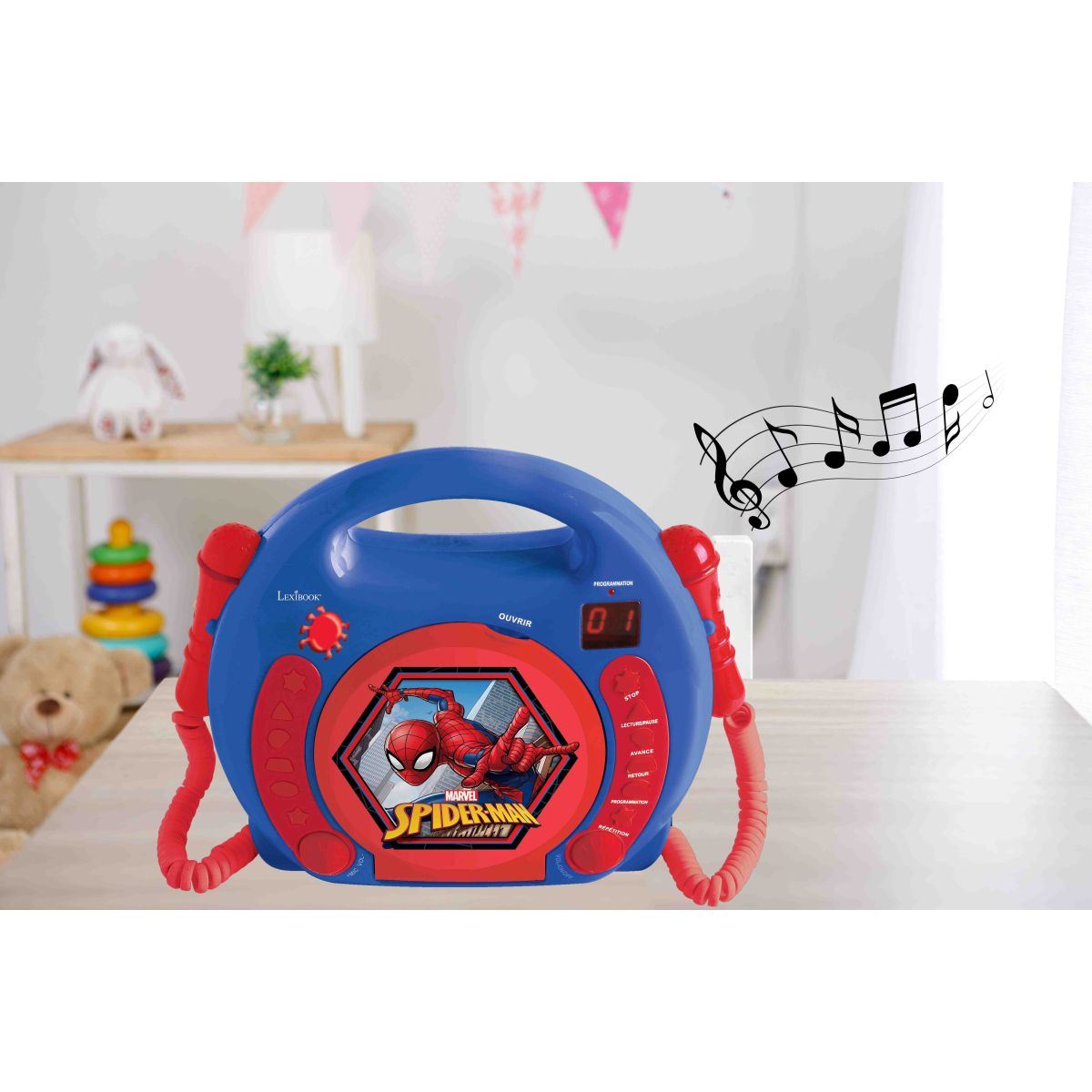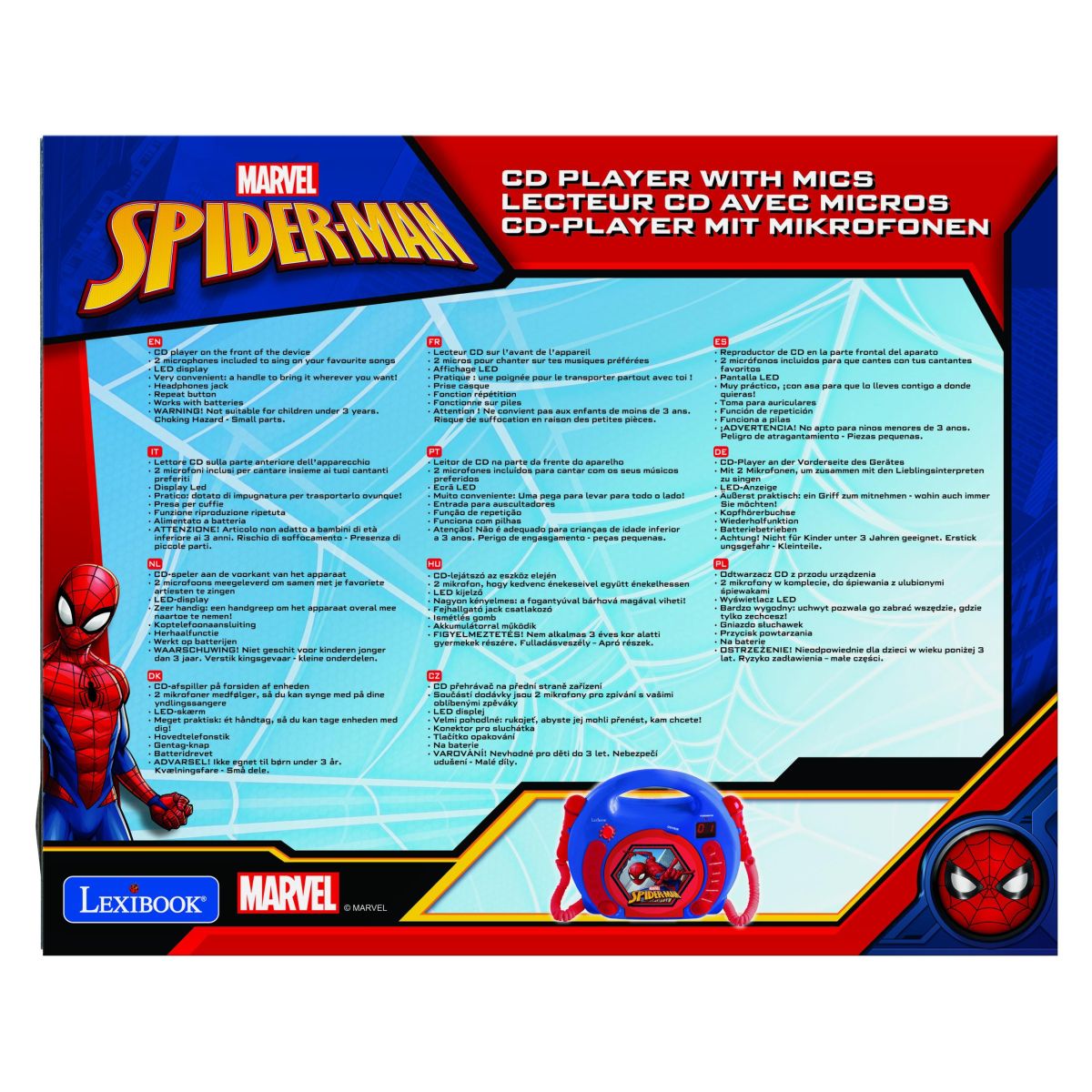 Lexibook CD prehrávač Spiderman so 2 mikrofónmi prináša deťom veľa zábavy pri spievaní aj hraní rolí priamo doma. Jednoduché ovládanie umožňuje deťom spievať samostatne alebo v spoločnosti kamarátov a rozvíjať tak svoju kreativitu a sebavedomie.