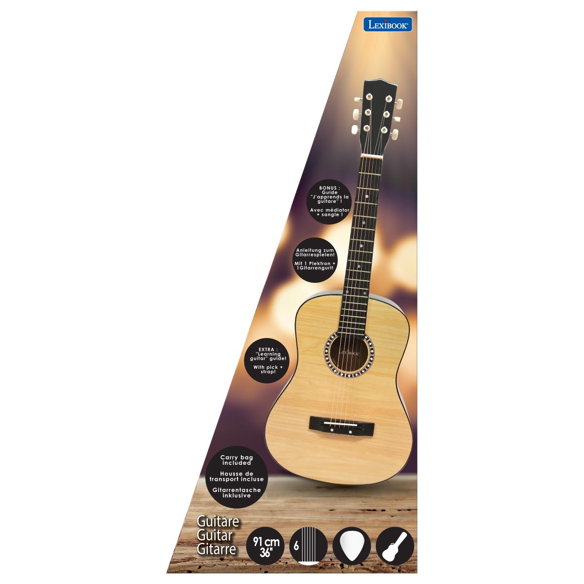 Lexibook drevená akustická gitara 36''/91 cm s taškou je ideálnym spoločníkom pre malých hudobníkov od 6 rokov. Vďaka pevnej drevenej konštrukcii a praktickej taške sa hodí na hranie doma aj na cestách.