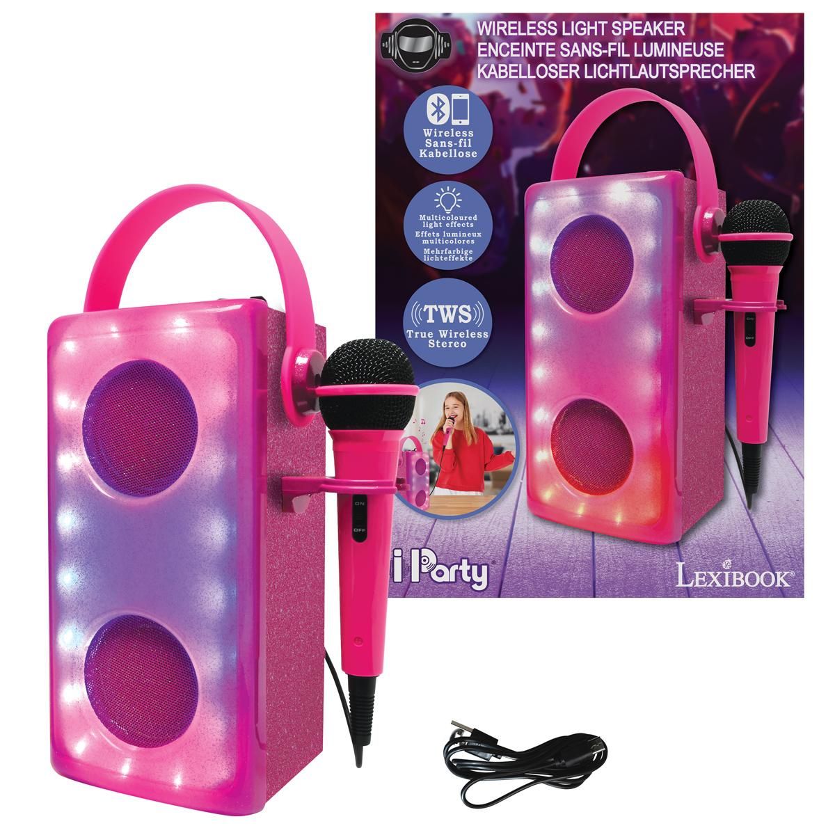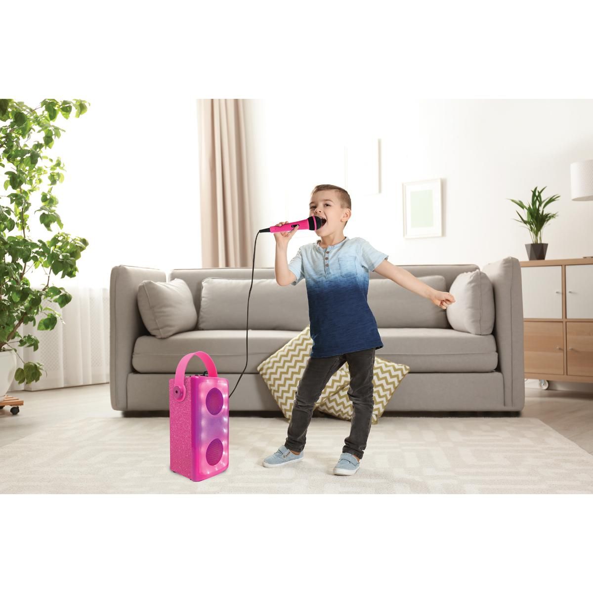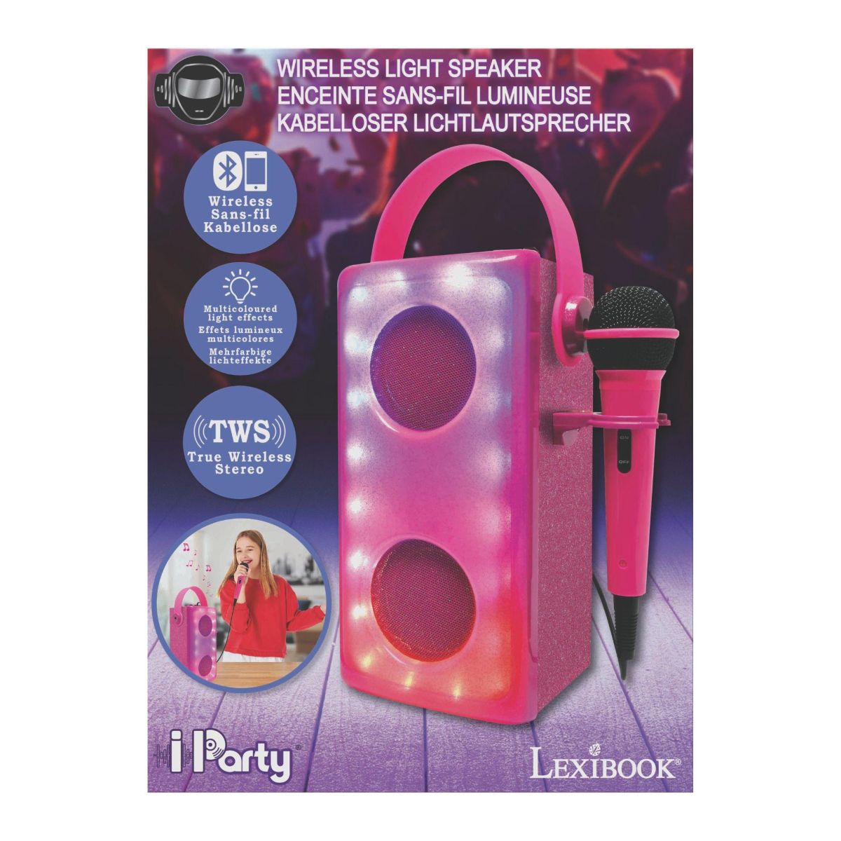 Lexibook iParty bluetooth reproduktor ružový so svetelnými efektmi a mikrofónom prináša deťom veľa zábavy pri speve aj hre na malé hviezdy karaoke scény.