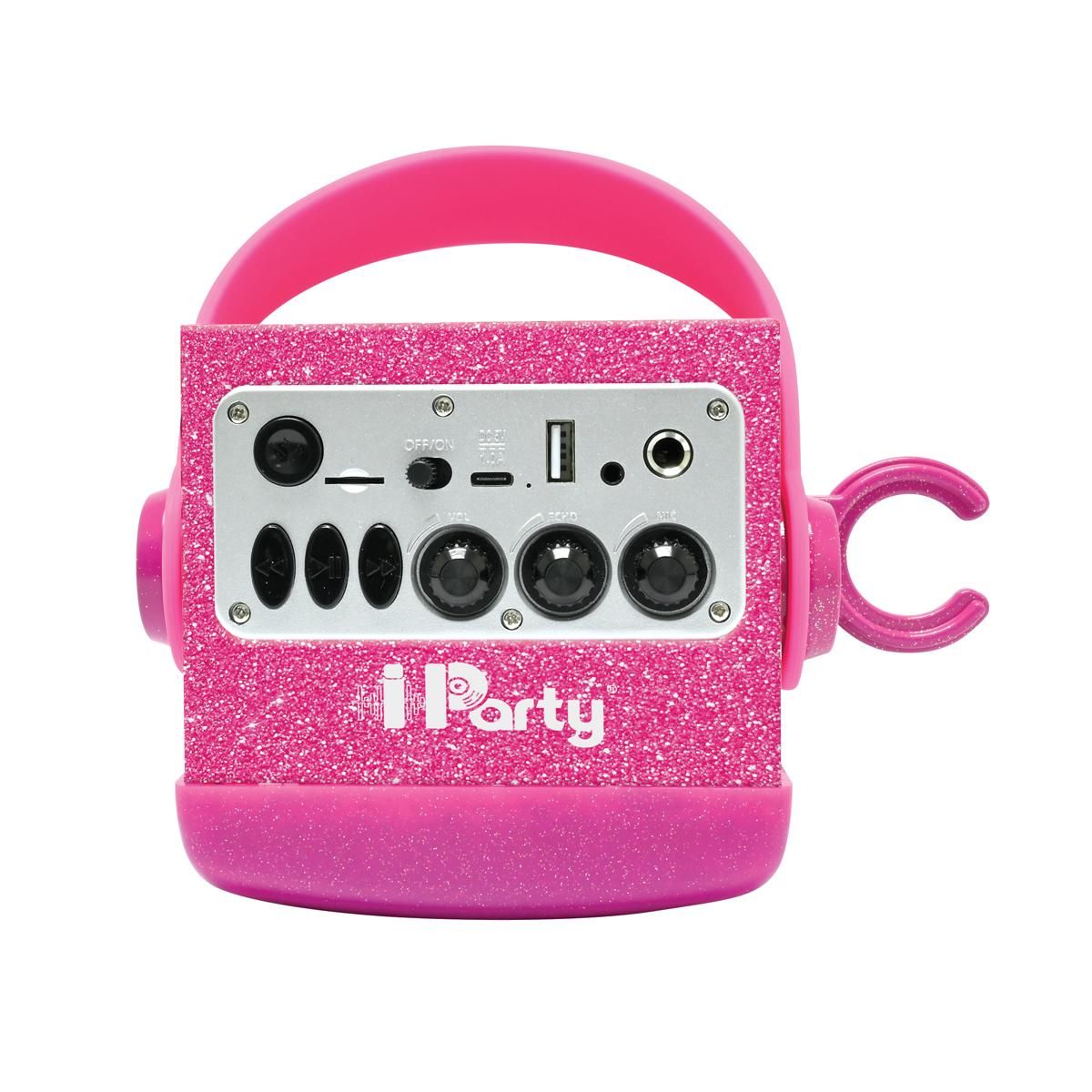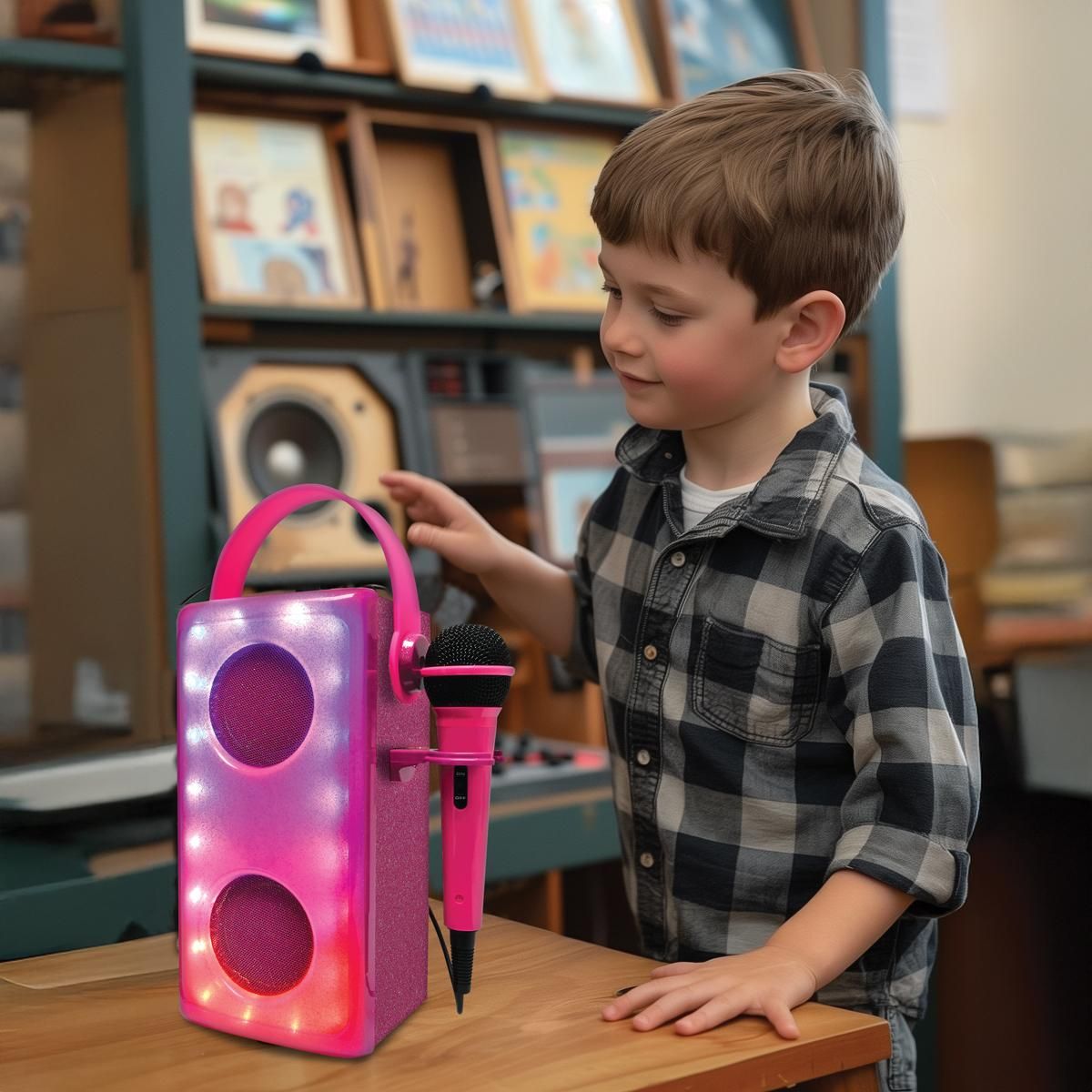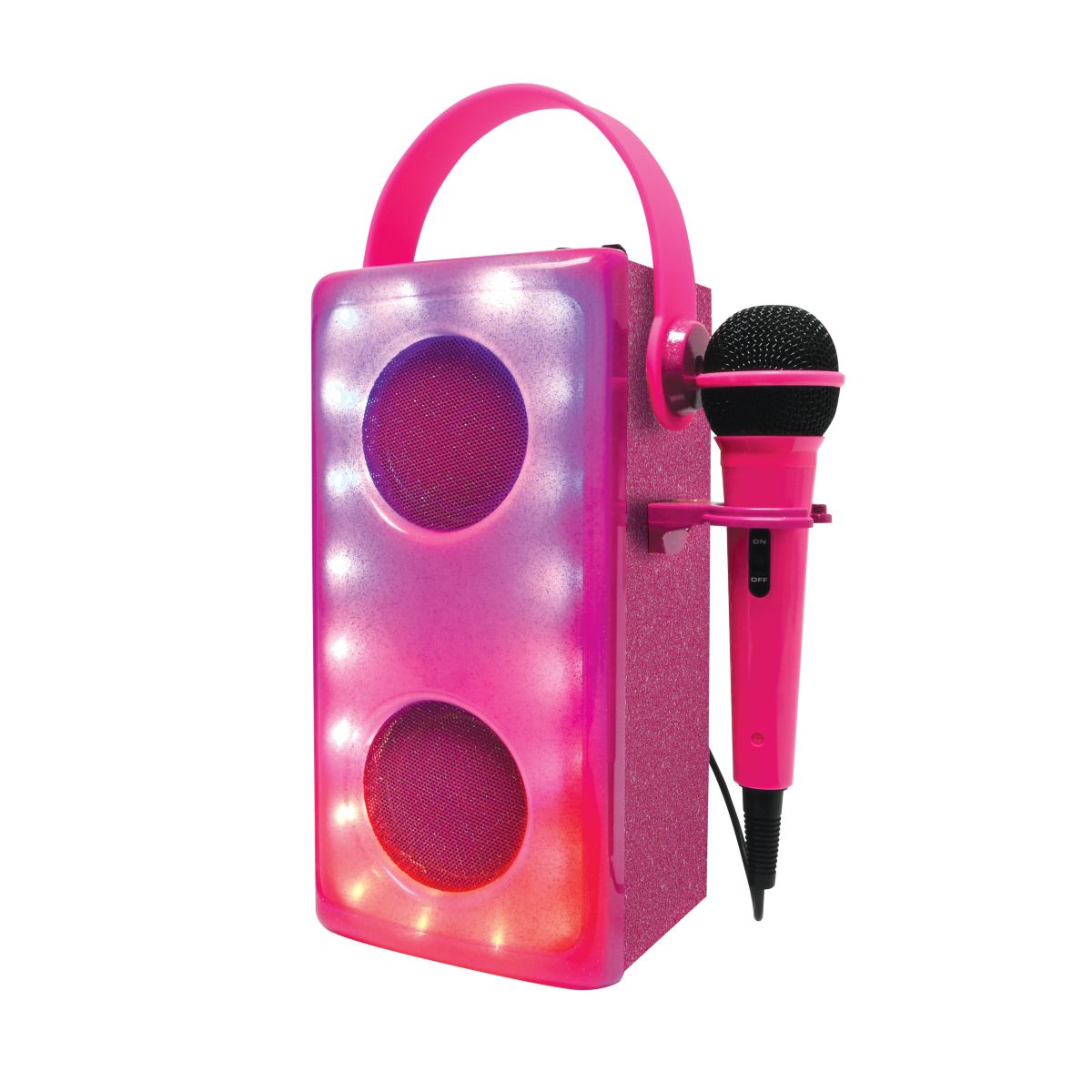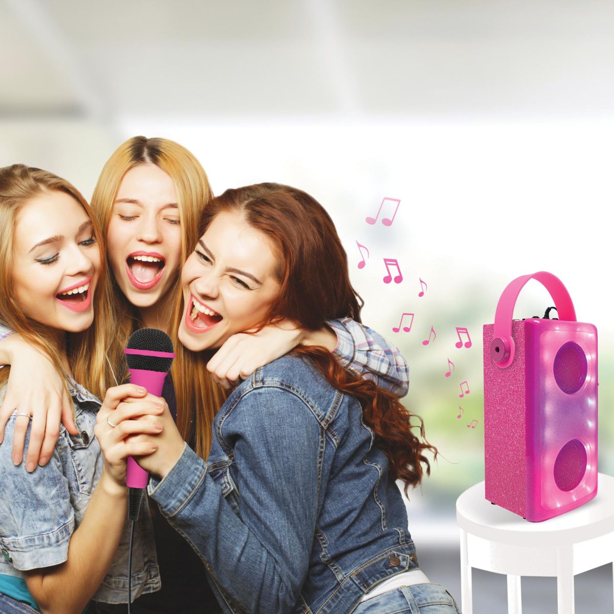 Lexibook iParty bluetooth reproduktor ružový so svetelnými efektmi a mikrofónom prináša deťom veľa zábavy pri speve aj hre na malé hviezdy karaoke scény.
