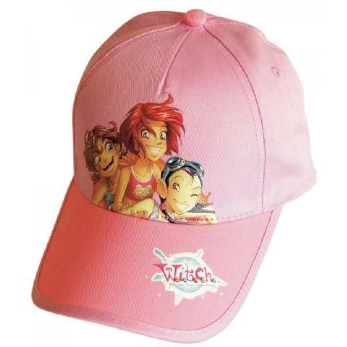Dívčí růžovou šiltovku zdobí obrázek tří vysmátých tváří a samotný kšilt zdobí nápis Witch.