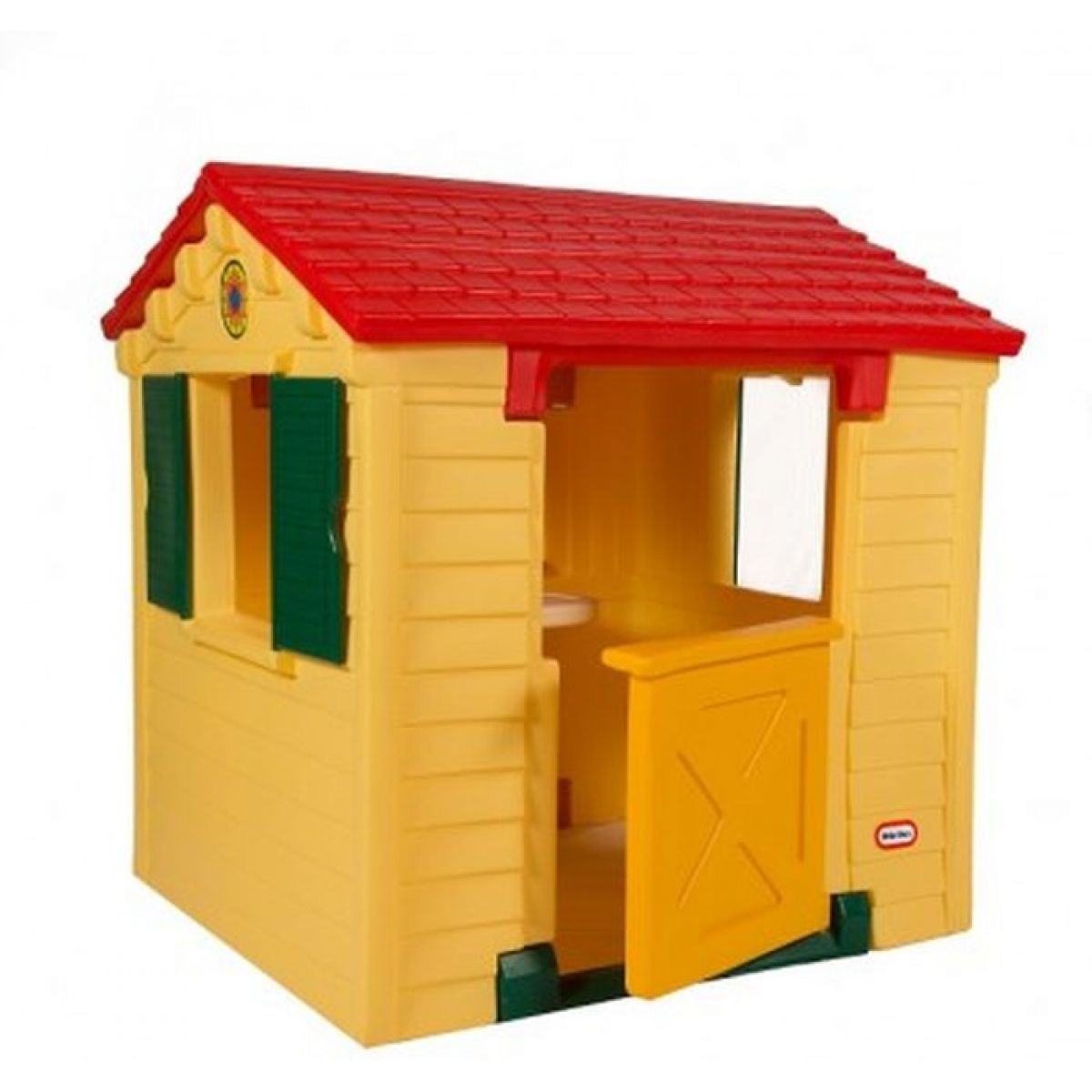 Domeček na hraní Natural má otevírací dveře a okna s okenicemi, na pohled vypadá jako opravdový dřevěný domek se šindelovou střechou. Uvnitř domečku je pro děti připraven malý stoleček.