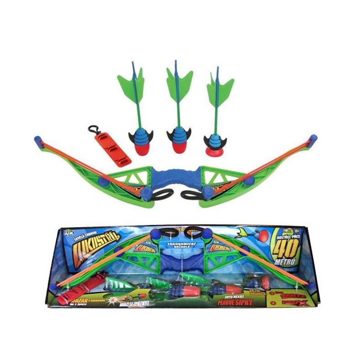 Vystřelovací systém, který pošle tvou odrážecí šipku přes 30 metrů daleko, střílej na zeď a šipka se ti odrazí zpátky nebo použij senzační šipku Zartz, která se přilepí a cca po 10 – 20 vteřinách sama pustí. Obsahuje: lukostříl, 2 odrážecí šipky a jednu šipku Zartz.