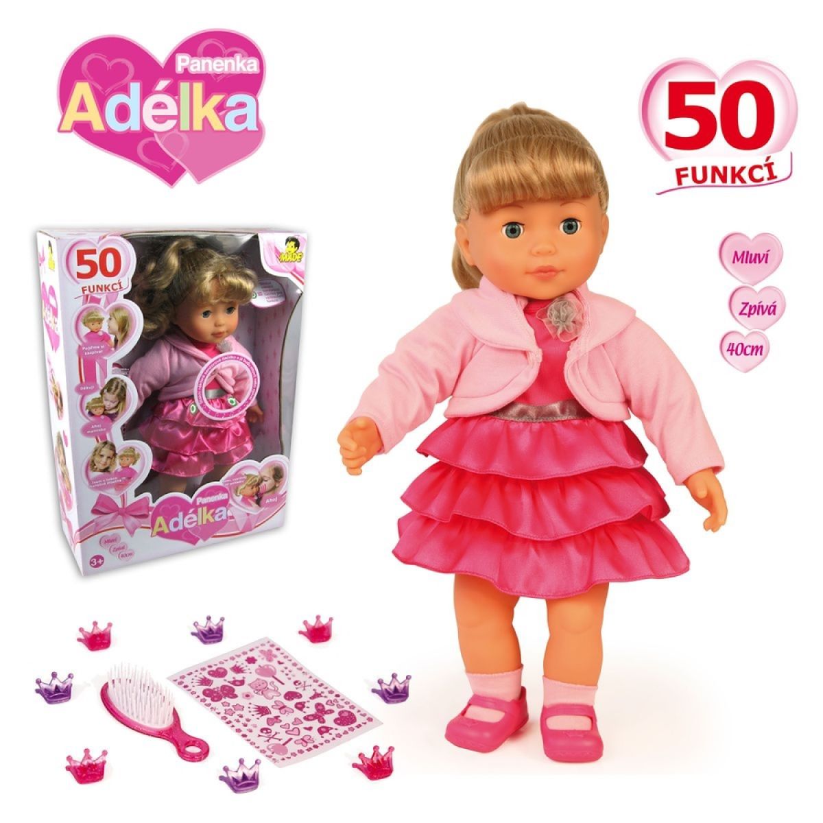 Úžasná panenka Adélka stiskem označeného místa říká různé české věty a zazpívá krásnou českou písničku. Panenka má měkké tělíčko a mrkací oči.