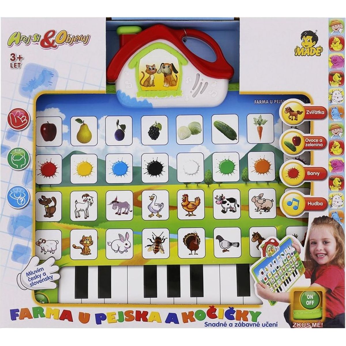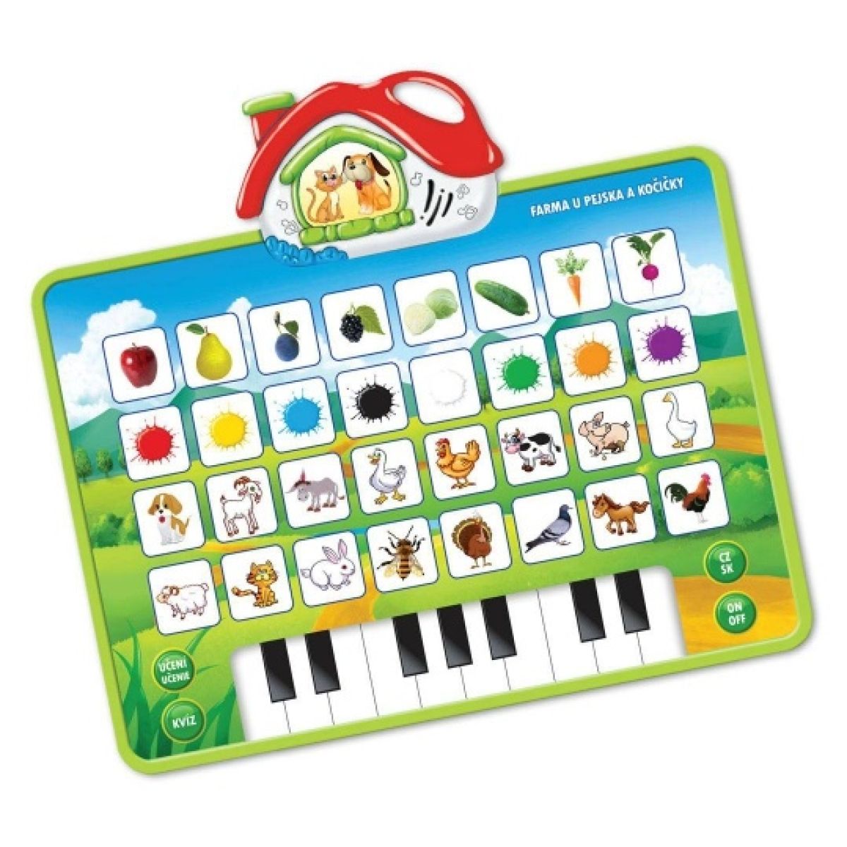 Dotyková podložka je pripravená pre deti od 3 rokov. Po stlačení zvieratiek sa ozývajú ich charakteristické zvuky. Klávesy vydávajú klasický zvuk piánka, ide zahrať obľúbené jednoduché melódie. Znalosti sa dajú overiť v jednoduchom kvíze.