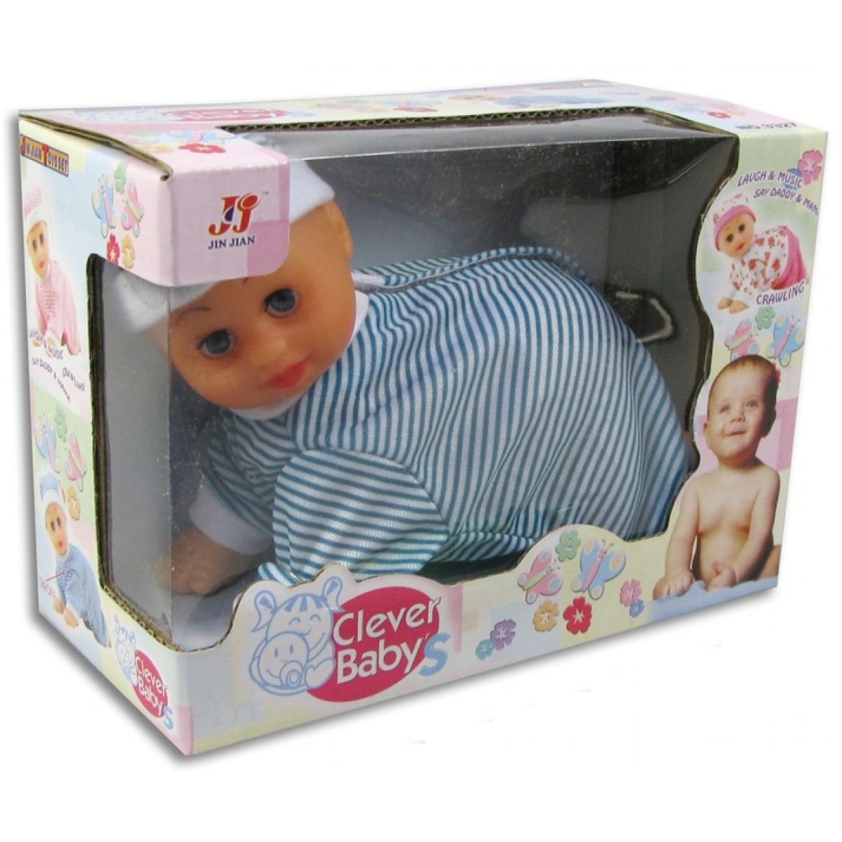 Lezoucí miminko v modro bílém pruhovaném oblečku s bílou čepičkou na hlavě je připravena pro holčičky od 3 let. Panenka má plastové tělíčko, také umí vydávat zvuky.