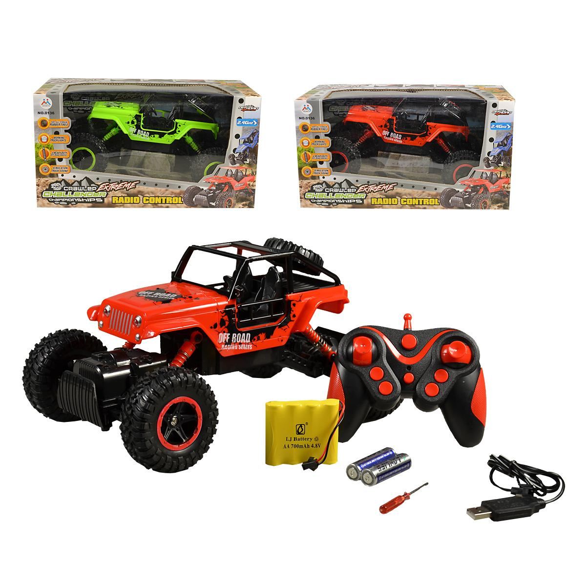 Terénní auto v oranžovém či zeleném provedení na dálkové ovládání, včetně příslušenství.