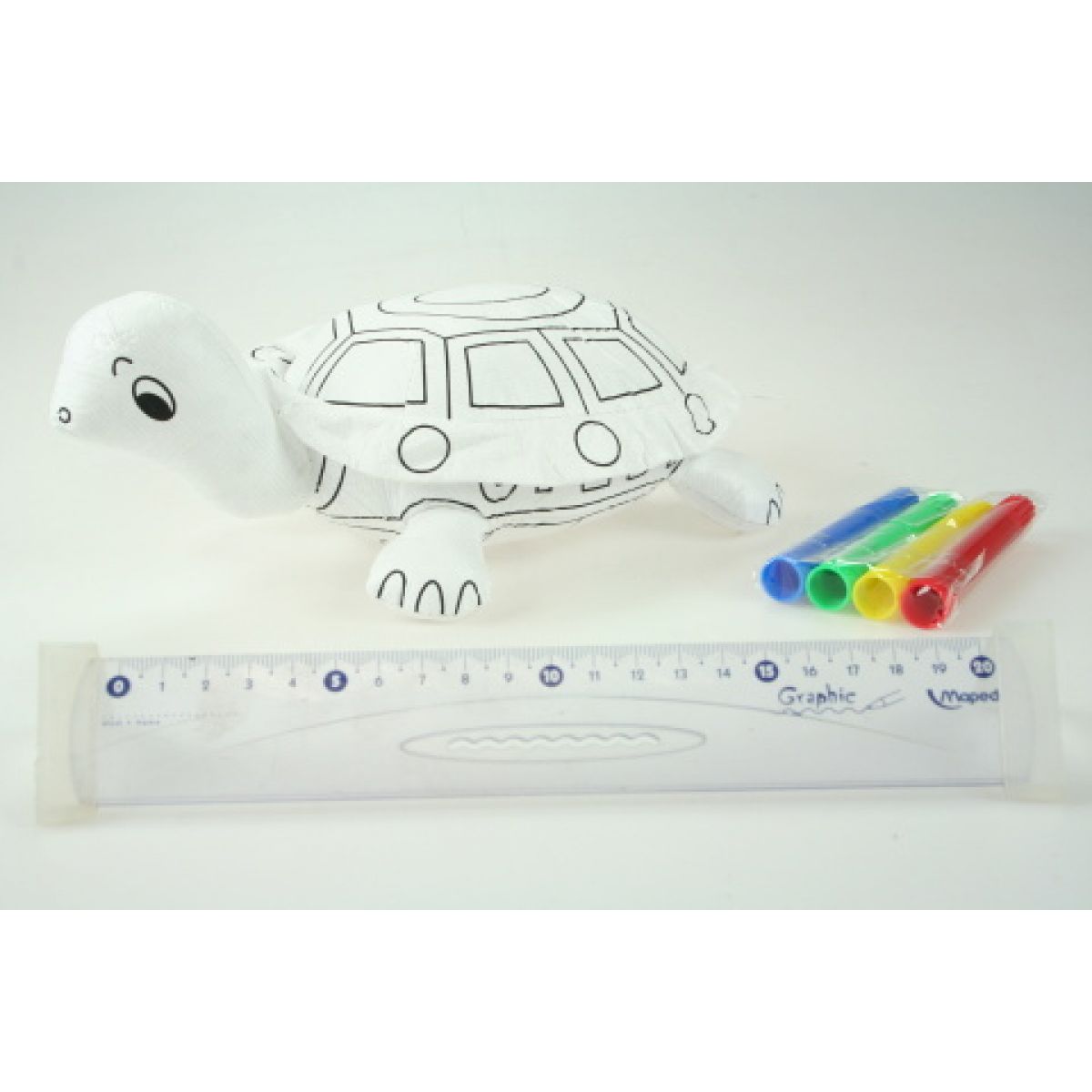 Textilní želva je měkkounká lehká hračka pro děti od 3 let, které rády tvoří a chtějí dát své hračce originální podobu. Mají k dipozici 4 barevné fixy přiložené v balení. Fixy jsou pratelné, proto je možné povrch oživovat a opětovně vytvářet.