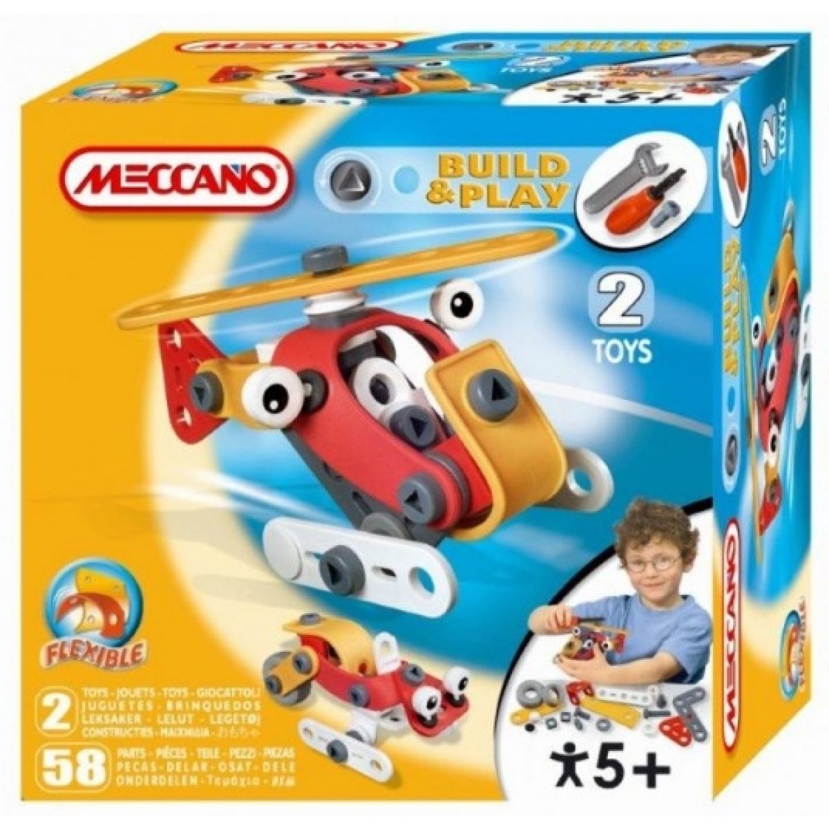 Postav si a hrej! Stavebnice je založena na unikátním systému ohebného plastu a gumy bez ostrých hran, vhodná pro děti od 5 let, umožňuje postupně sestavit 2 modely dle názorných obrázkových návodů KROK ZA KROKEM a pomocí přiloženého nářadí – šroubováku a klíče. Rozvíjí představivost a jemnou motoriku u dětí.