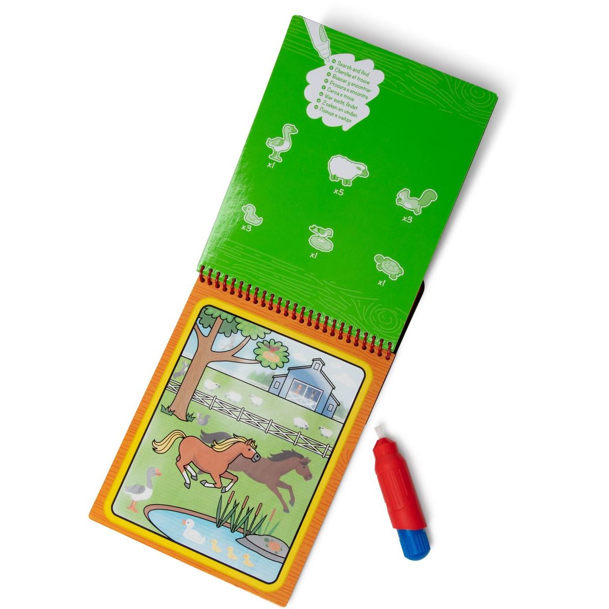 Naplň pero, dotkni sa archu a sleduj, ako sa z čiernobielych obrázkov stávajú farebné scény plné zvieratiek, traktorov a vidieckej pohody.