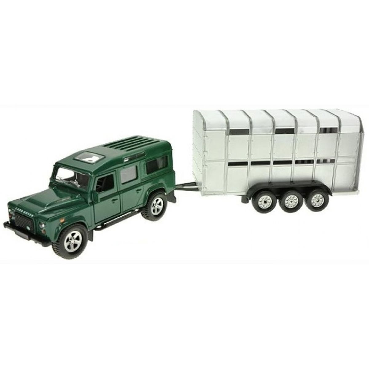 Terénní kovové auto na setrvačník Land Rover Defender má otevíratelné přední a zadní dveře a navíc odnímatelný přívěs, do něhož může vaše dítě naložit zvířátko a kamkoliv jej převézt.