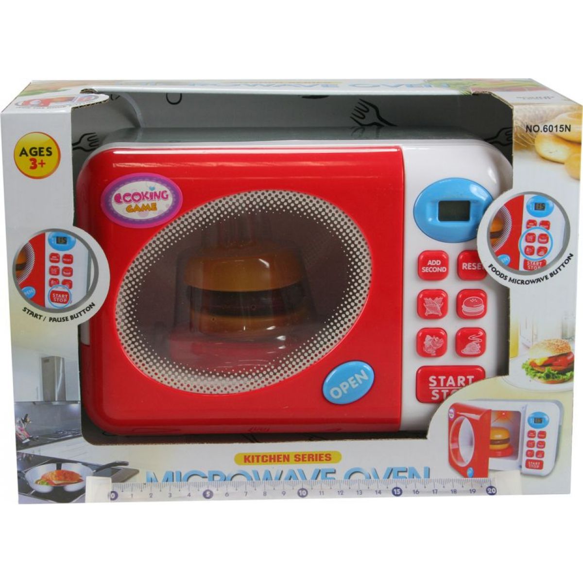 Bílá dětská mikrovlnka s červenými dvířky čeká malé kuchařinky a kuchtíky od 3 let. Až si připraví talíř s maketou hamburgeru, mohou otevřít dvířka, vložit ho do mikrovlnky, nastavit program na funkčním displeji a spustit její chod. Talíř se bude otáčet, vnitřek trouby je osvětlený.