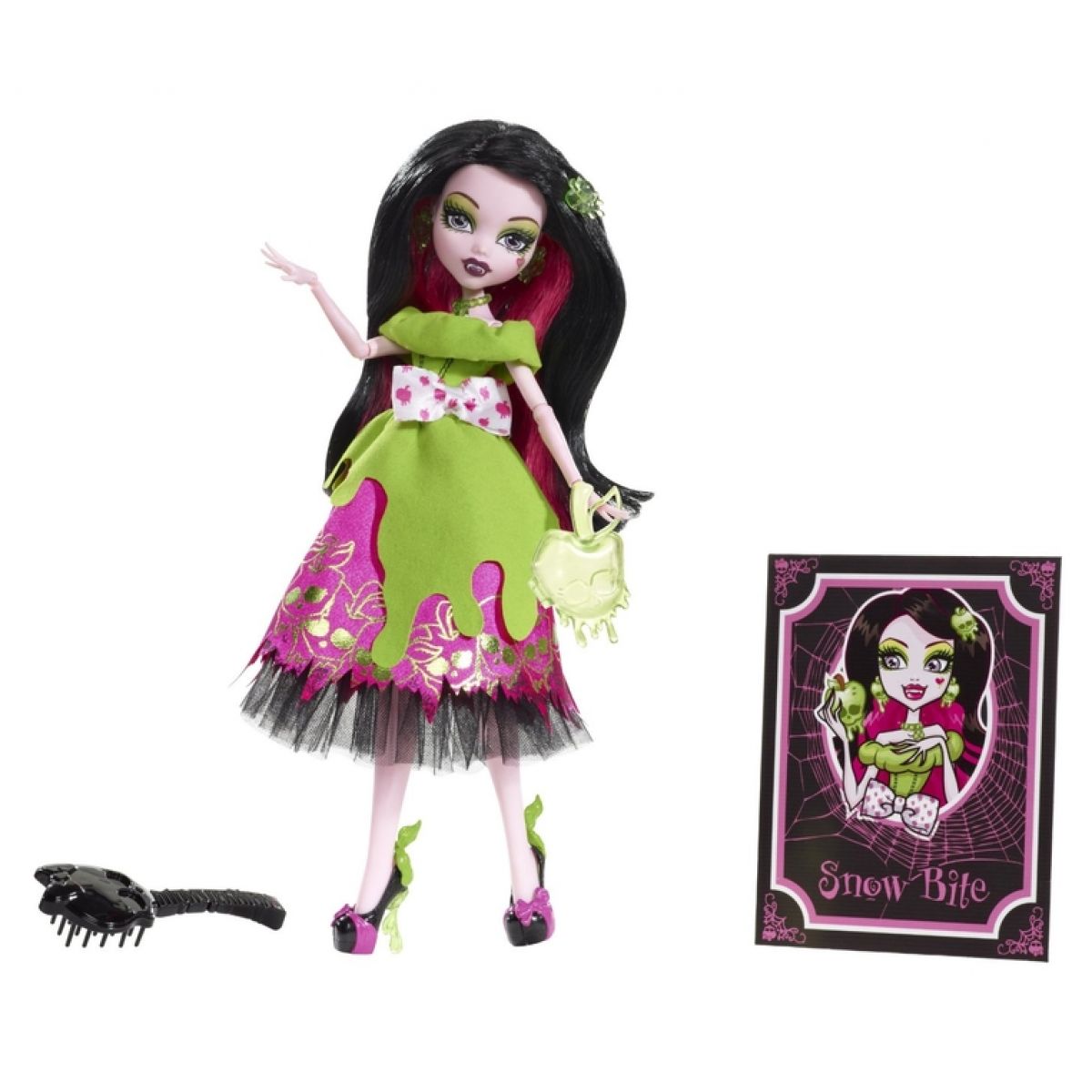 Draculaura, jedna z Monster panenek kolekce TGT, která přichází za holkama od 6 let z hororové pohádky. Má černé rozpuštěné vlasy s fialovým podkladem, splývajících až k pasu. Čarodějně střižené šaty dokreslují její působivost.