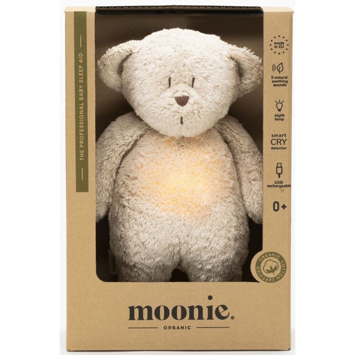 Zažite pokojné zaspávanie s Moonie Zaspávačikom Medveďom 2.0 Organic Sand. Tento medvedík s nočným svetlom a relaxačnými zvukmi pomáha bábätku cítiť sa bezpečne a ľahko zaspať. Má päť prírodných zvukov, sedem farieb svetla a senzor, ktorý zapne svetlo a zvuky, keď dieťa začne plakať. Hračka je vyrobená z mäkkej organickej bavlny a je bezpečná pre deti od narodenia. Dobíja sa cez USB a vydrží až 8 hodín. Vhodné pre deti od 0 mesiacov - Rozmery: 28 x 16 x 10,5 cm - USB dobíjanie - 5 relaxačných zvukov - 7 farieb nočného svetla - Časovač a senzor plaču - Prateľné po vybratí modulu - Organická bavlna a recyklovaný materiál