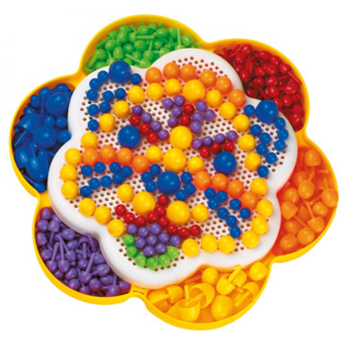 Souprava rozvíjející dětskou motoriku, tvořivost a fantazii se skládá z hrací desky a kontejneru ve tvaru sedmikrásky a 260 kolíčků s hlavičkami o průměru 10,15 a 20 mm.
