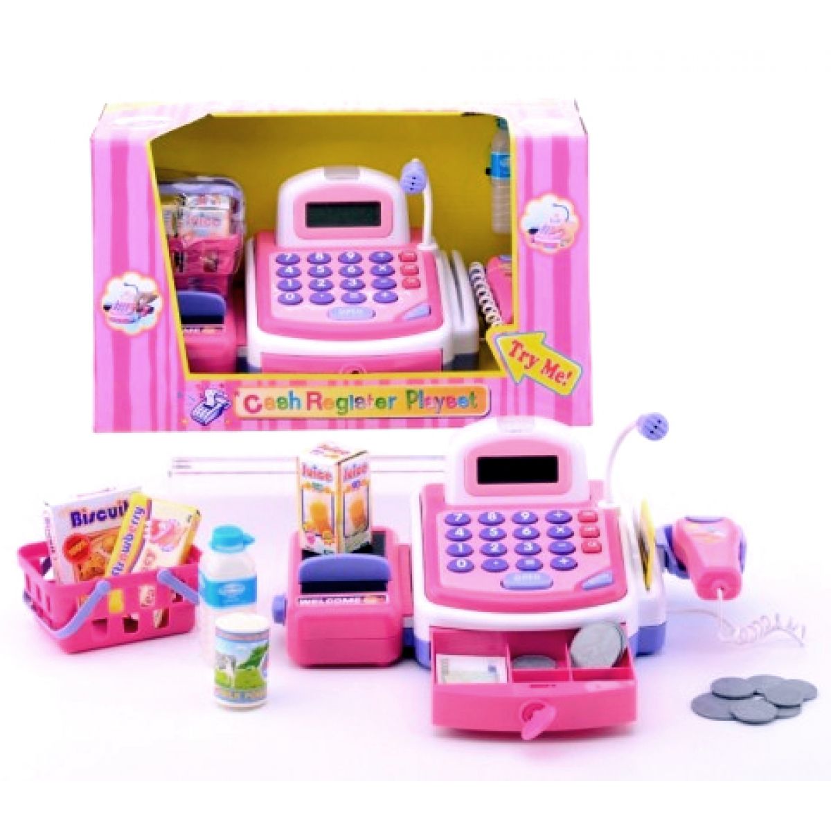 Elektronická multifunkční pokladna s příslušenstvím. Zahrnuje nákupní košík, potraviny, čtečku karet, skener a mince. Světelné a zvukové efekty.