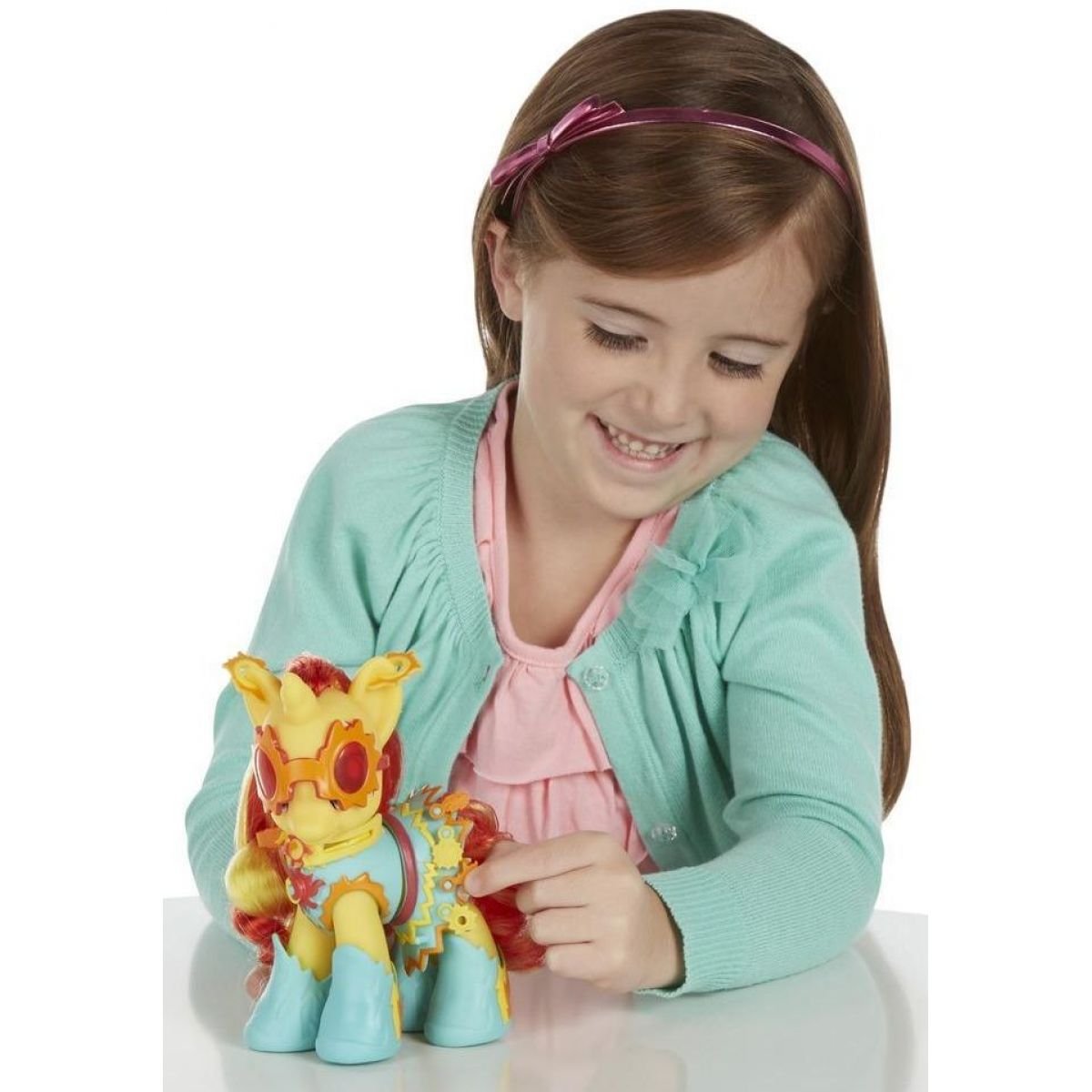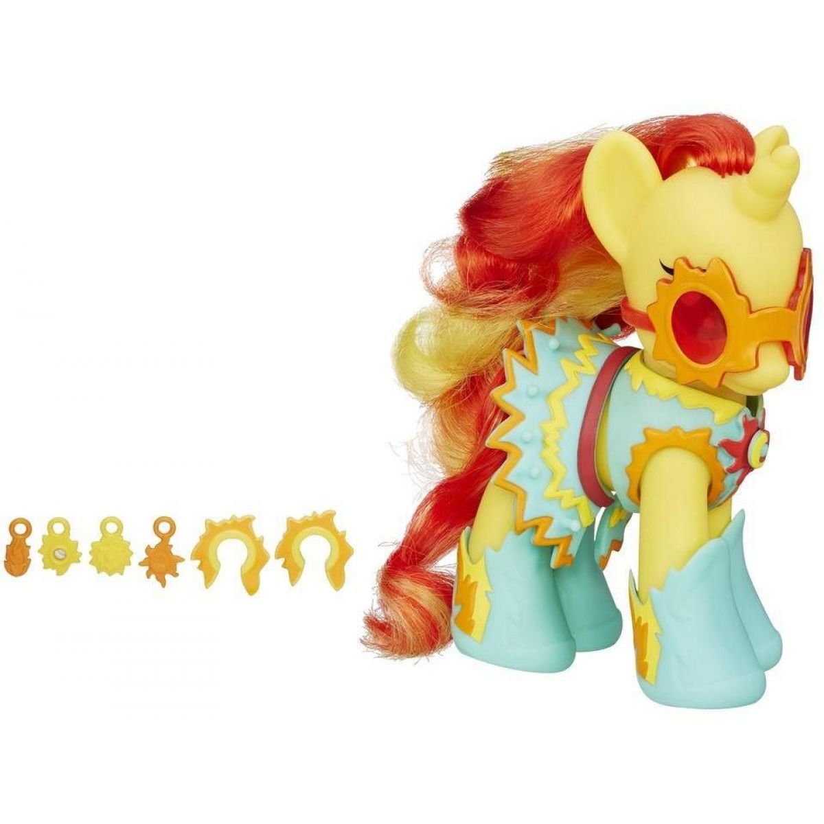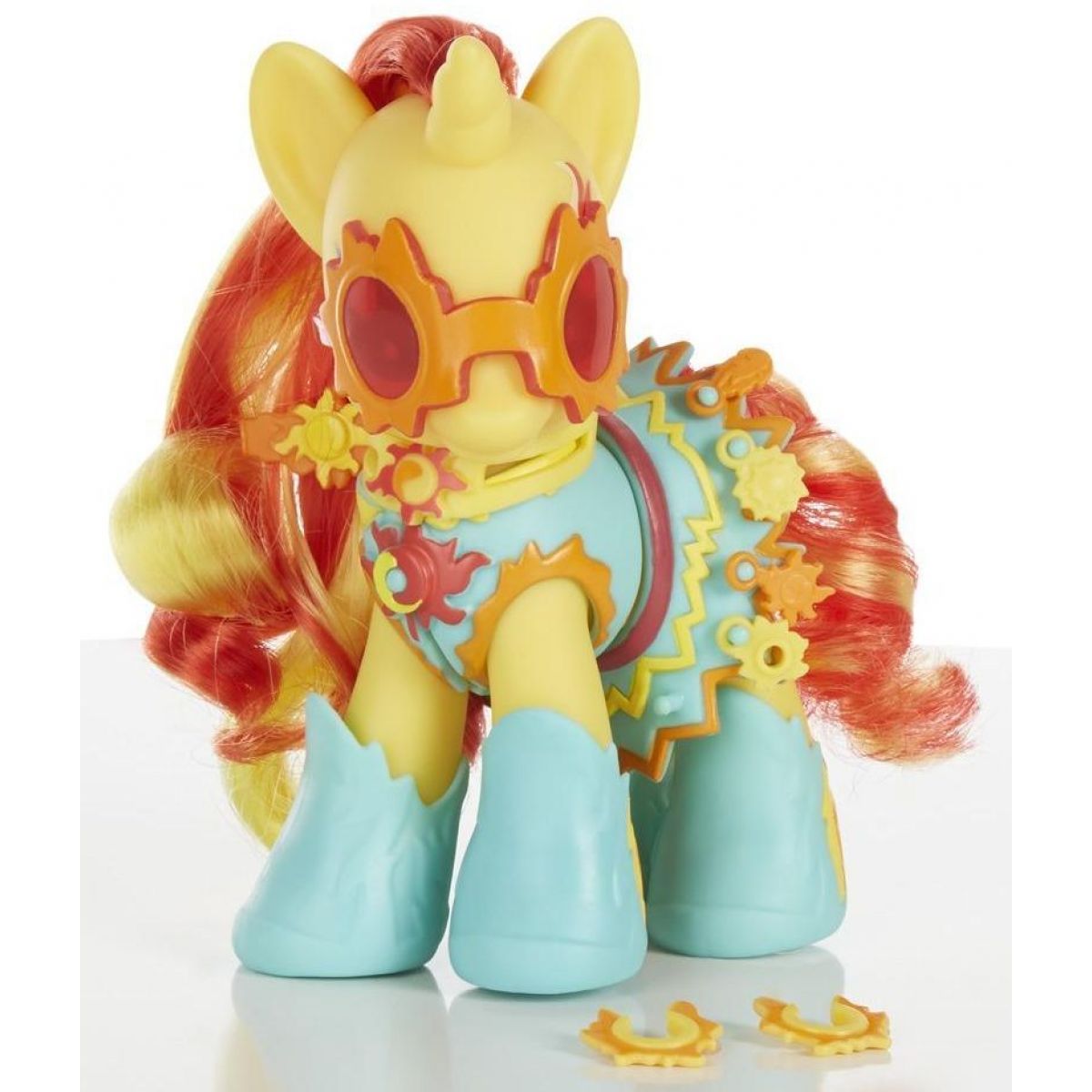 Sunset Shimmer má barevné šaty, boty stejné barvy a sluneční brýle. Stačí načesat hřívu, nazdobit přiloženými doplňky a může vyrazit do společnosti. Je jedním z poníků, kteří spolu zažívají různá dobrodružství a stále si potvrzují, že není nad to, mít dobré kamarády. V nabídce jsou na výběr další poníci pro vytvoření celé sbírky.