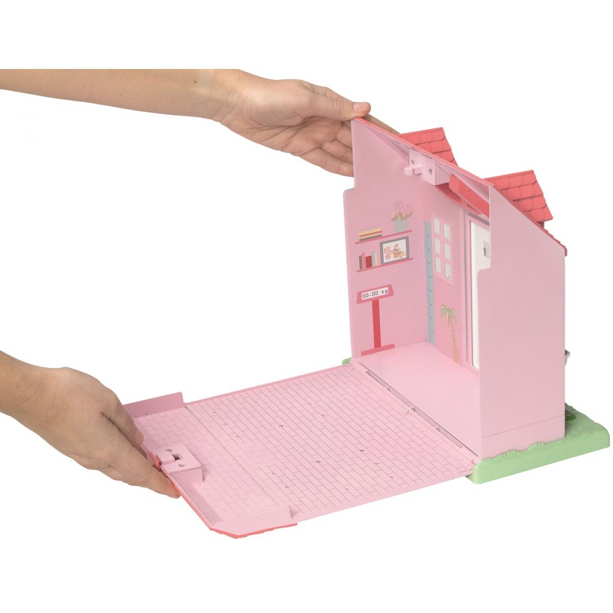 Sada obsahuje křeslo, stůl, dětskou postýlku, panenku doktorku a miminko, rozkládací domeček.