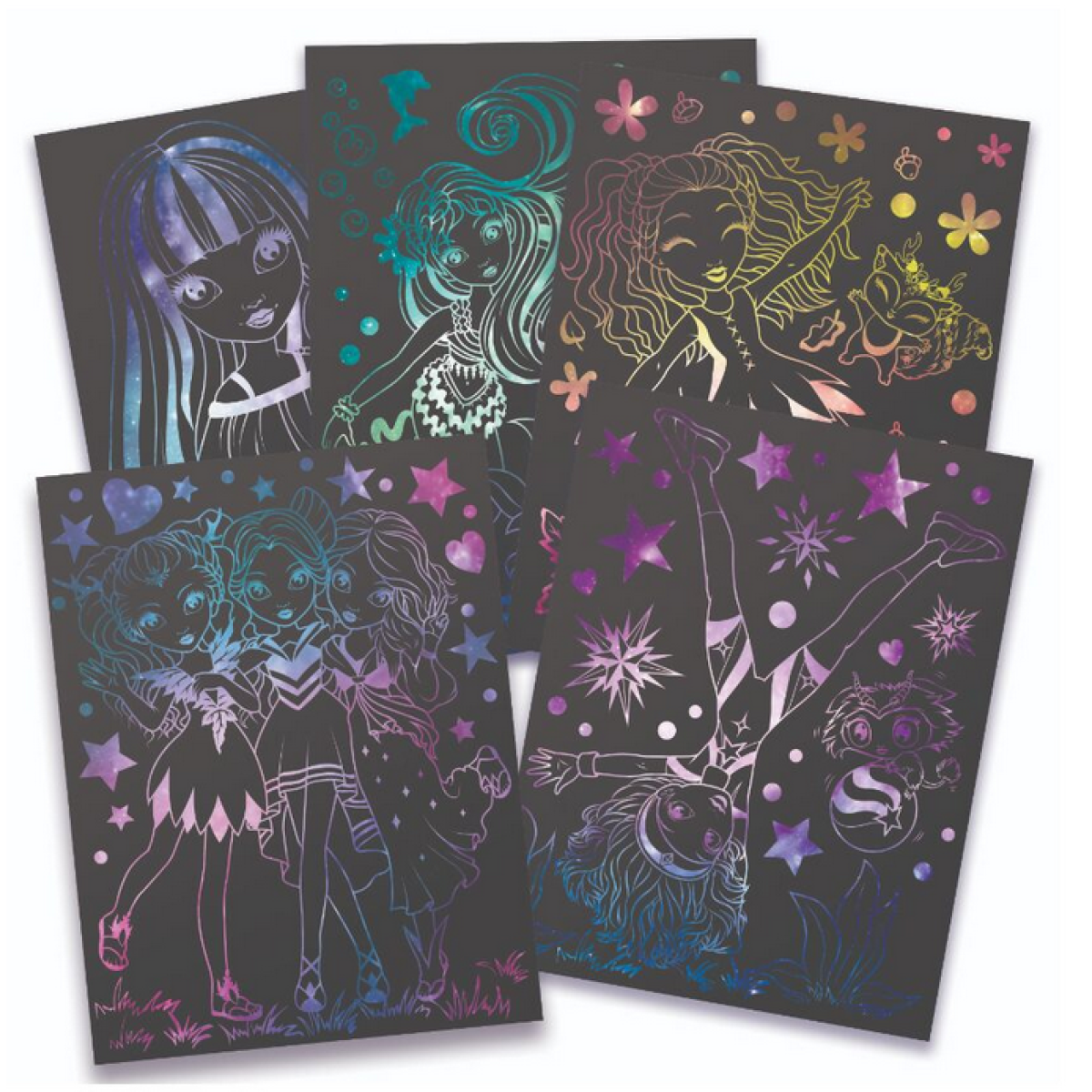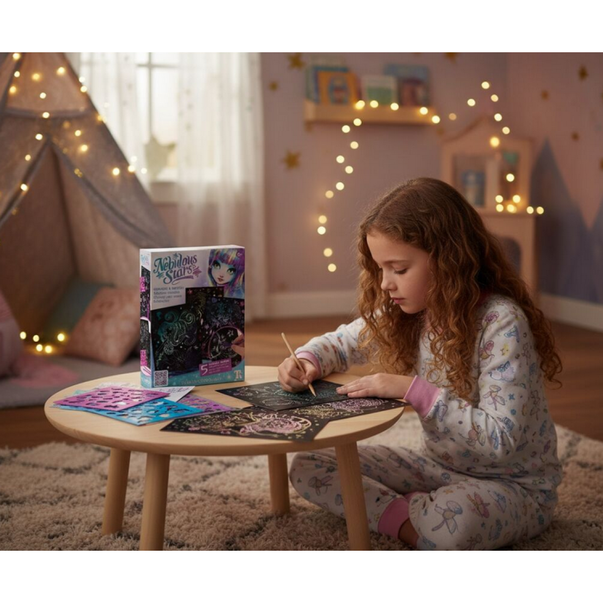 Ponorte sa do sveta farieb, fantázie a hviezd s kreatívnou sadou Nebulous Stars! Pomocou špeciálnych nástrojov môžete z tmavých doštičiek postupne odhaľovať žiarivé motívy a vytvárať vlastné malé umelecké diela. Každý ťah vyškrabávacieho pera odhalí novú hru farieb a tvarov – a s pomocou šablón a príbehu Isadory získa vaše tvorenie magický dotyk.