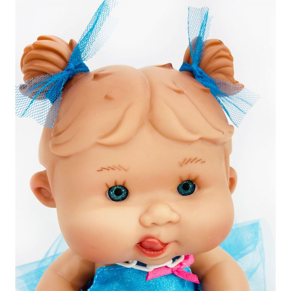 Vinylová panenka v modrých šiatočkách čaká na dievčatká od 3 rokov. Môžu ju vykúpať a uspať s malým ružovým dudlíkom. Dudlík nemožno vložiť panenke do úst.