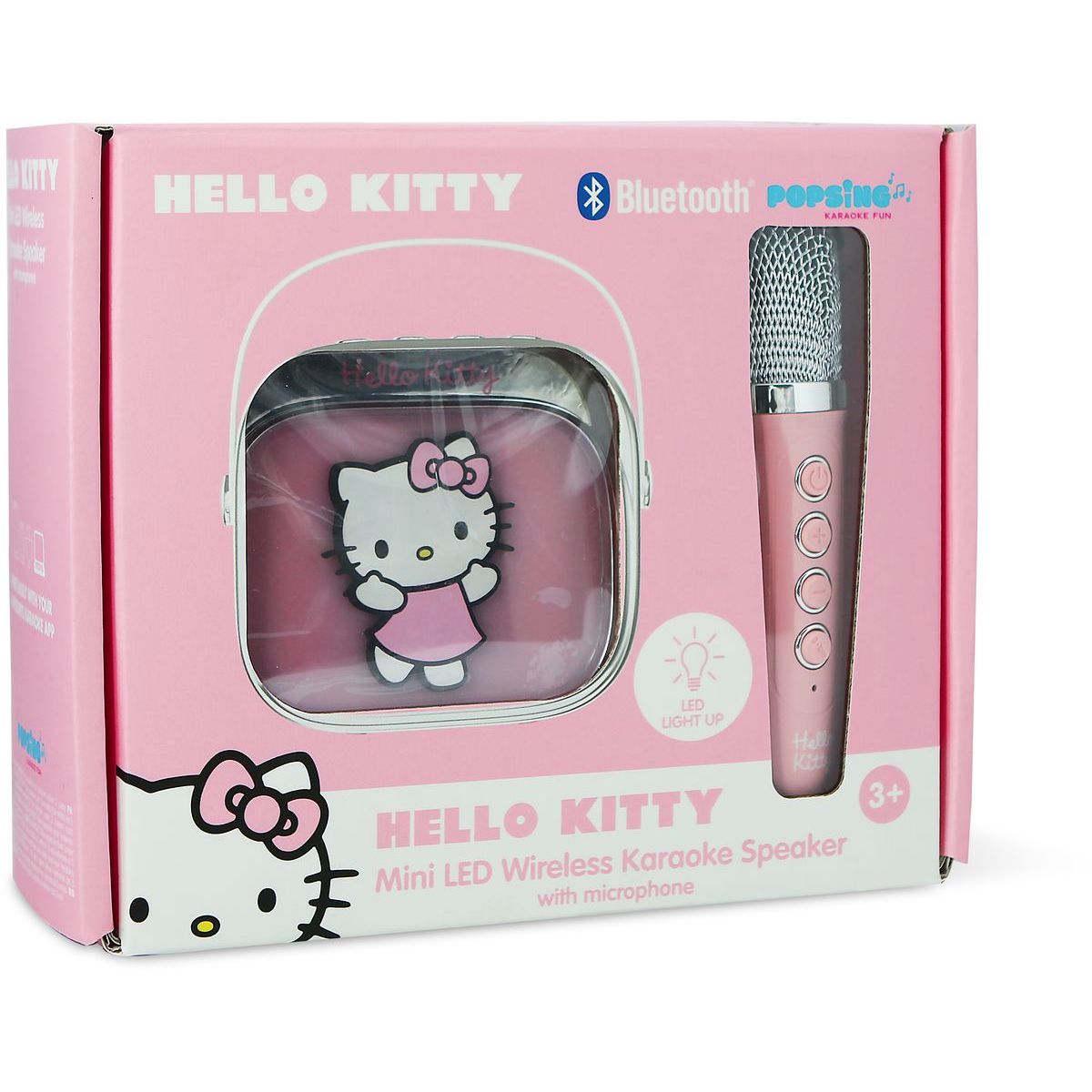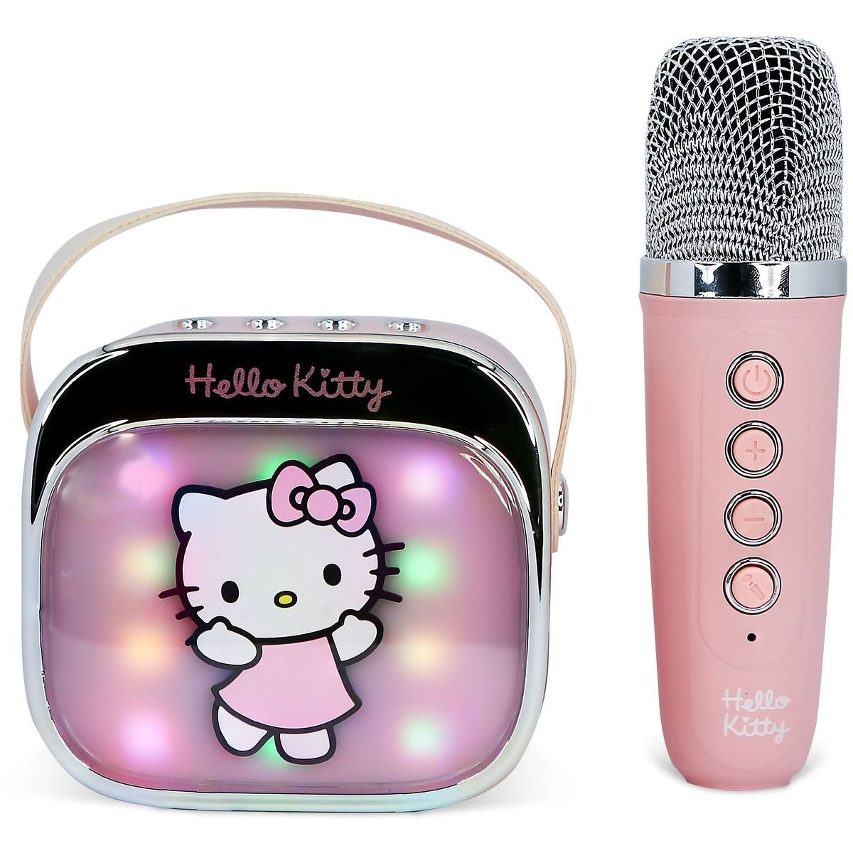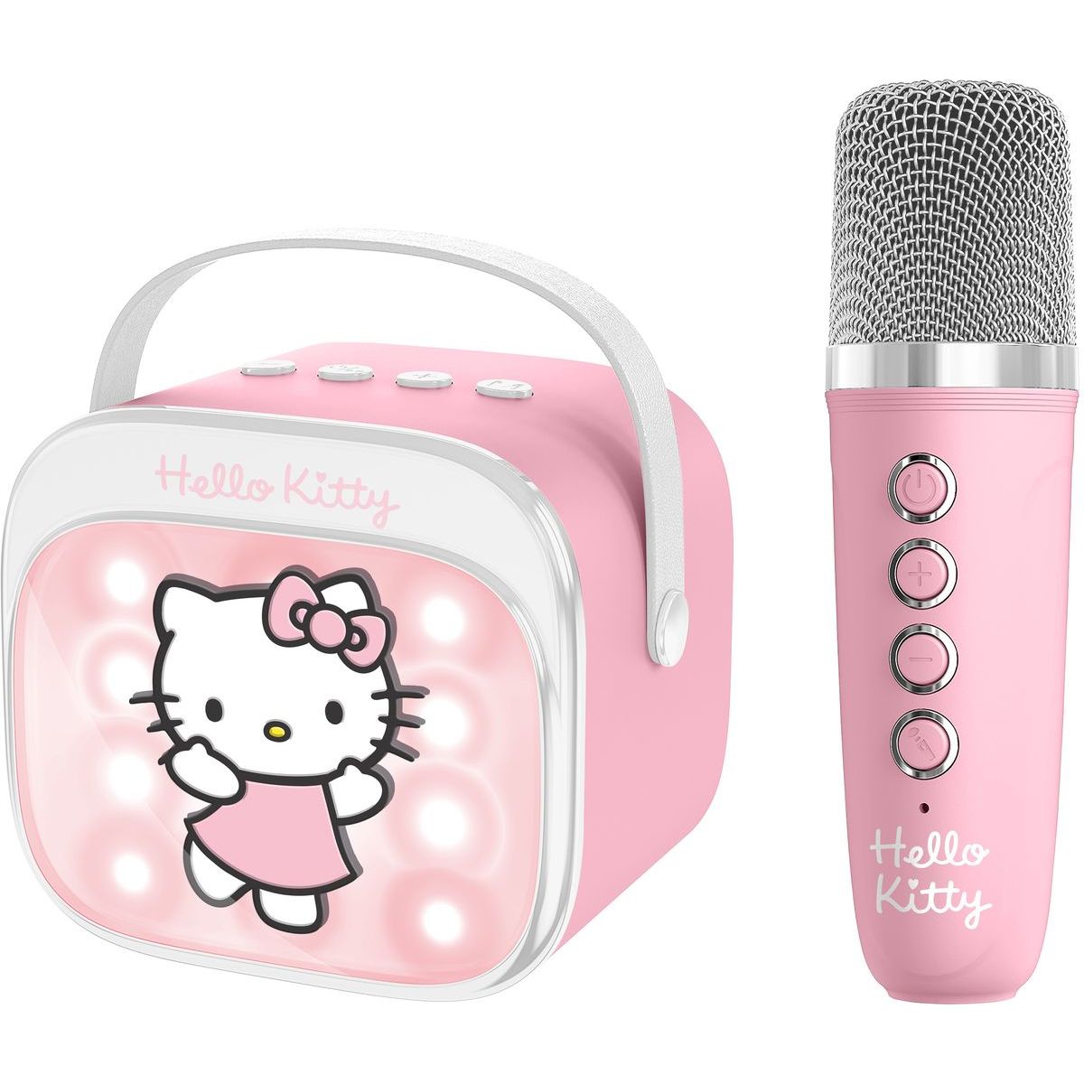 Prenosný karaoke reproduktor OTL Technologies Hello Kitty PopSing je ideálny pre deti od troch rokov, ktoré milujú spev! S farebnými LED svetlami a jednoduchým pripojením cez Bluetooth® si môžu deti užívať zábavu kdekoľvek chcú. Výkon reproduktora zabezpečí čistý zvuk a batéria vydrží až štyri hodiny nepretržitej zábavy. Mikrofón s motívom Hello Kitty je ľahký a pohodlný pre malé ruky, čo dodáva každej piesni ešte väčšiu radosť.