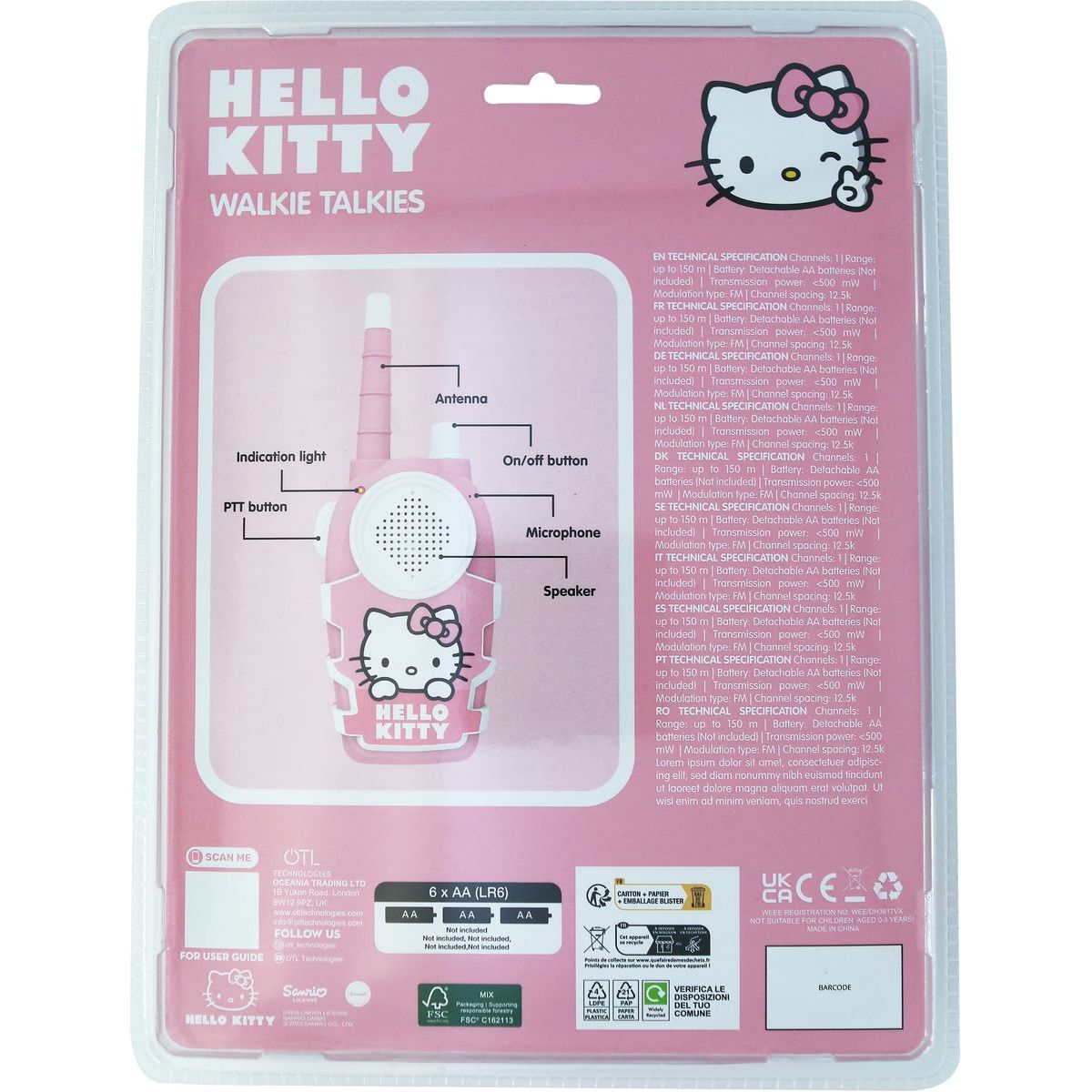 Chcete deťom dopriať zábavu plnú dobrodružstiev doma aj vonku? Sada vysielačiek Hello Kitty od OTL Technologies je ideálnym riešením! Jednoduché tlačidlo Push-to-Talk umožňuje malým rukám ľahko ovládať prístroj a dosah až do 150 metrov prináša veľa radosti pri spoločných hrách vonku i vo vnútri. Vysielačky sú ľahké a odolné – skvelý spoločník na každé detské dobrodružstvo na dvore alebo v parku. Stačí mať pripravené tri batérie AA pre každý kus (nie sú súčasťou balenia) a môžete vyraziť za nekonečnou zábavou s kamarátmi!