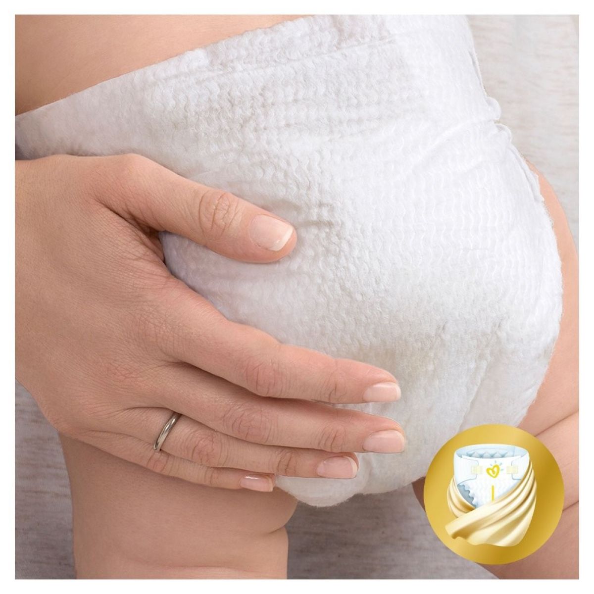 Pampers Premium Care velikosti 5 Junior s upevňovacími pásky slouží dětem od 11 do 25 kg.
