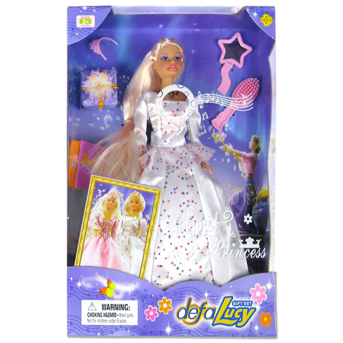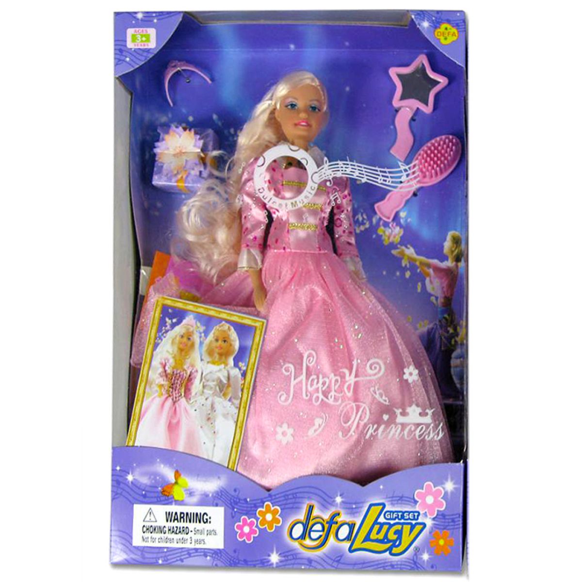 Panenka Lucy s dlouhými blond vlasy, oblečena do překrásných dlouhých růžových šatů, čeká na holčičky, které si budou chtít poslechnout, jak umí hrát.