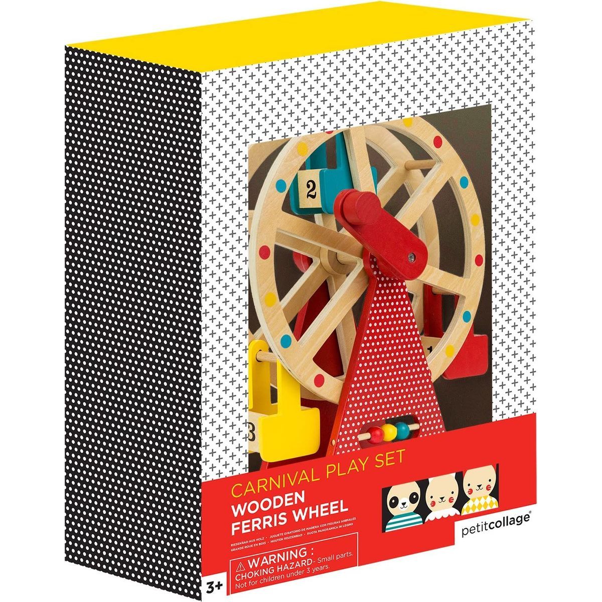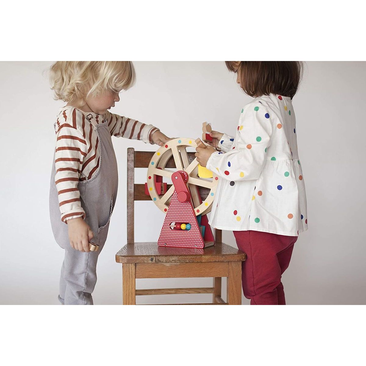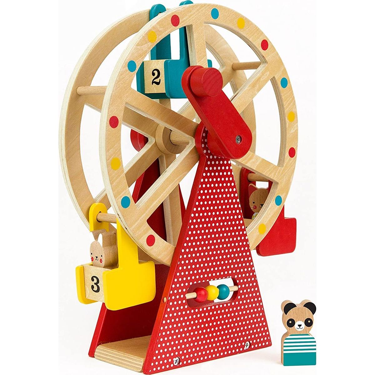 Drevené ruské koleso ponúka deťom zábavné otáčanie pomocou rukoväte a tým zvezenie pre troch zvieracích kamarátov. Kabínky sú opatrené číslicami 1,2 a 3, rovnako tak má koleso v spodnej časti počítadlo s tromi farebnými guličkami pre počítanie jázd.