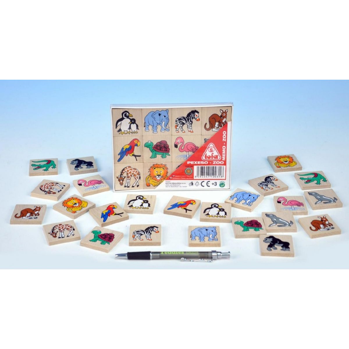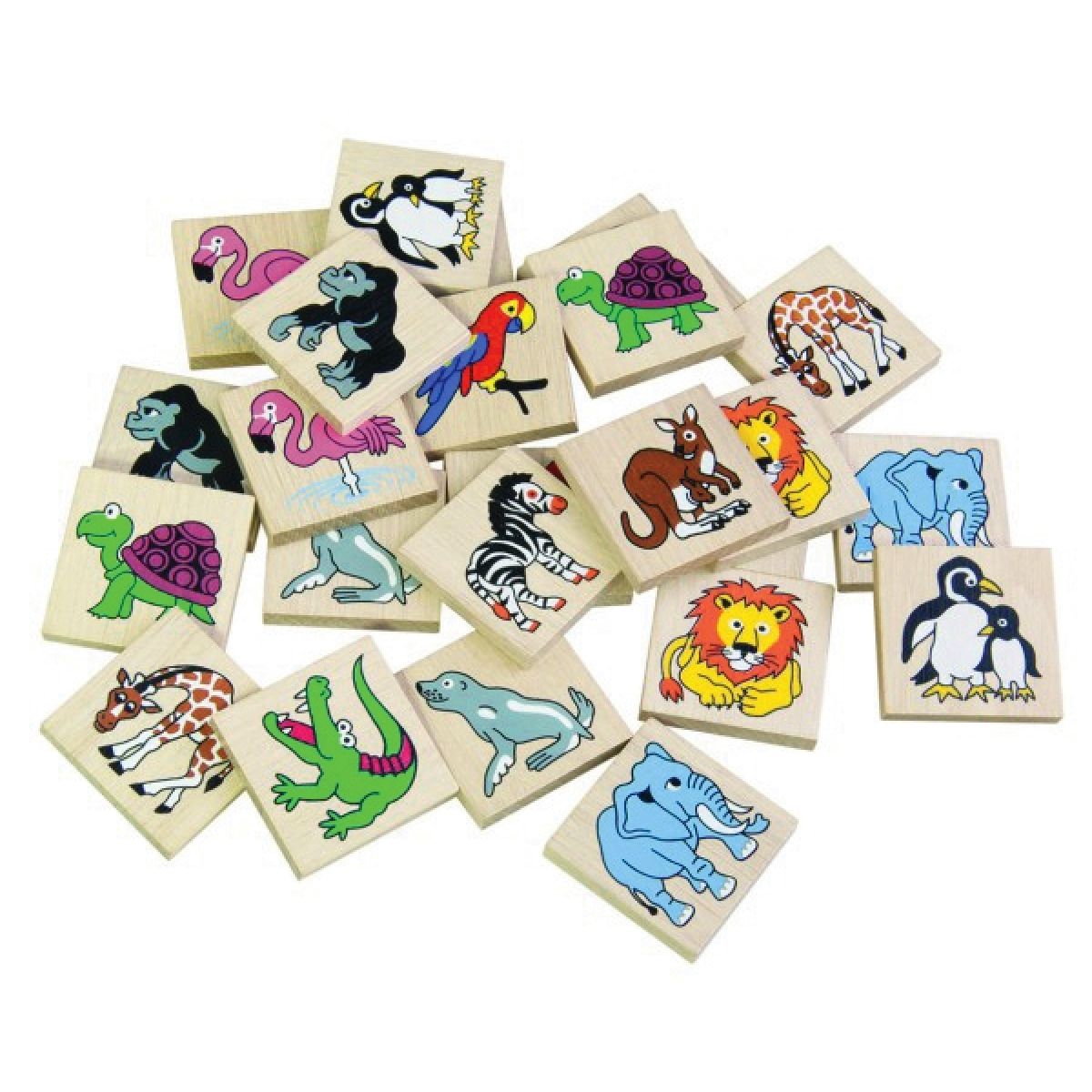 Dřevěné pexeso s obrázky zvířátek ze ZOO pro procvičení soustředění a paměti.