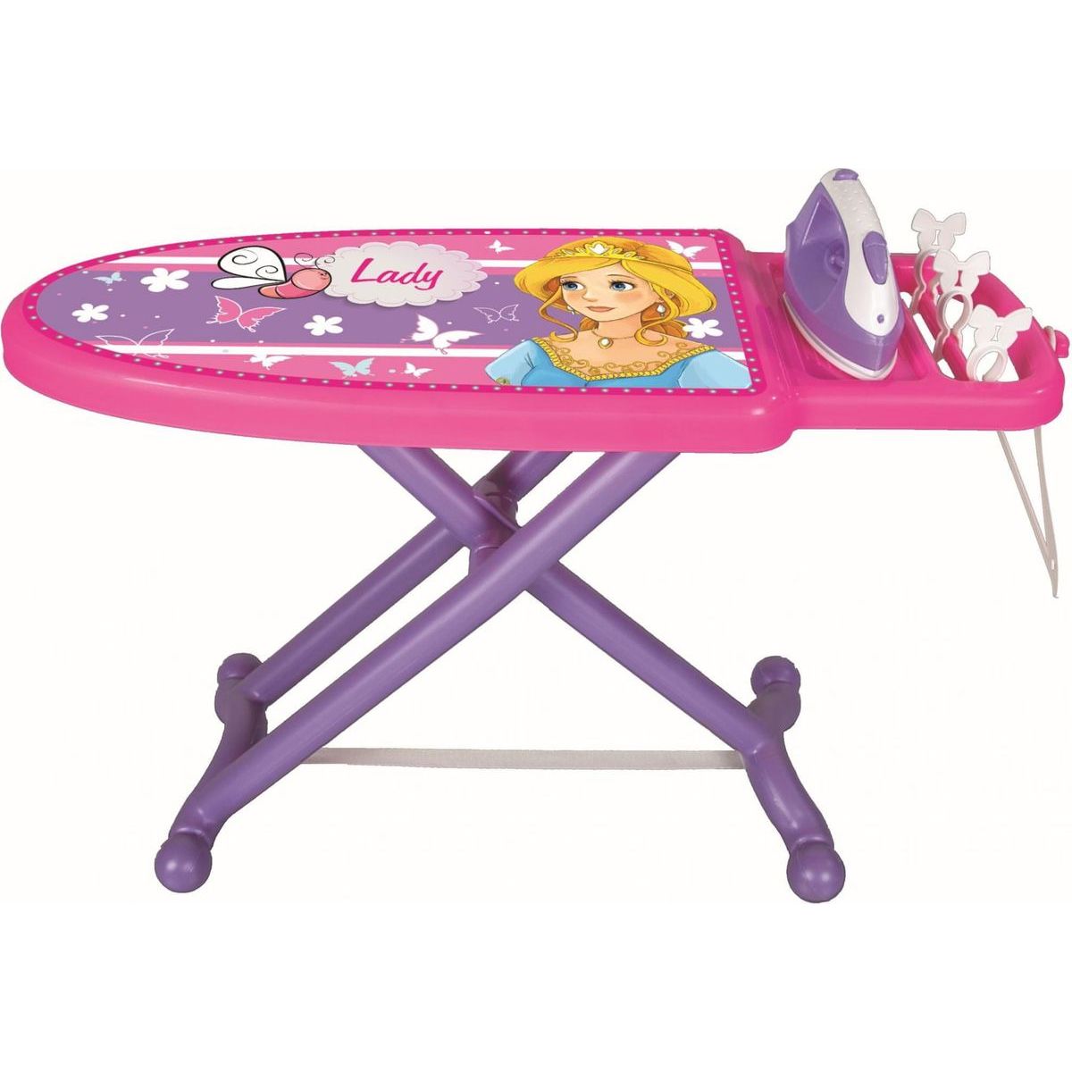 Žehlička v sade s žehliacou doskou pre malé gazdinky. Akonáhle malá gazdinka dožehlí, môže doska zložiť a upratať na svoje miesto.