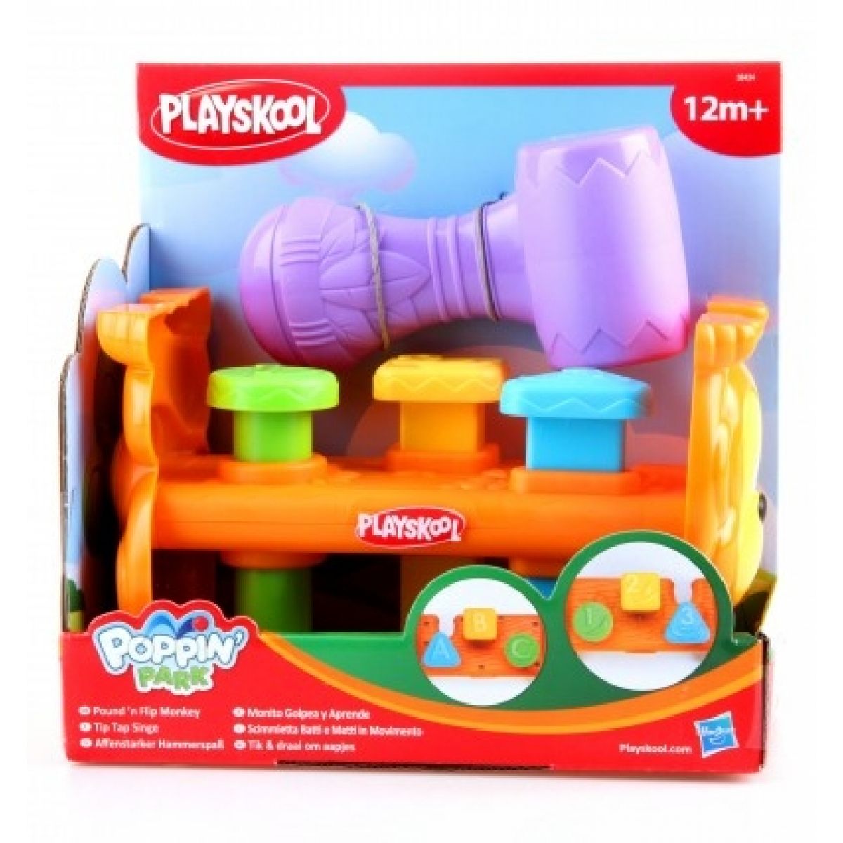 Zatloukací hračka, se kterou si dítě procvičí motoriku. Může zatloukat tři různě tvarované kolíky na zádech opičky…kulatý, čtvercový a trojúhelníkový. Navíc se při hraní seznámí s písmeny a číslicemi, protože na kolících seshora uvidí 1,2,3 a A,B,C. Až budou všechny kolíky zatlučené, otočte opičku vzhůru nohama a zábava může začít znovu. Kladívko jde snadno uložit po straně stolku.