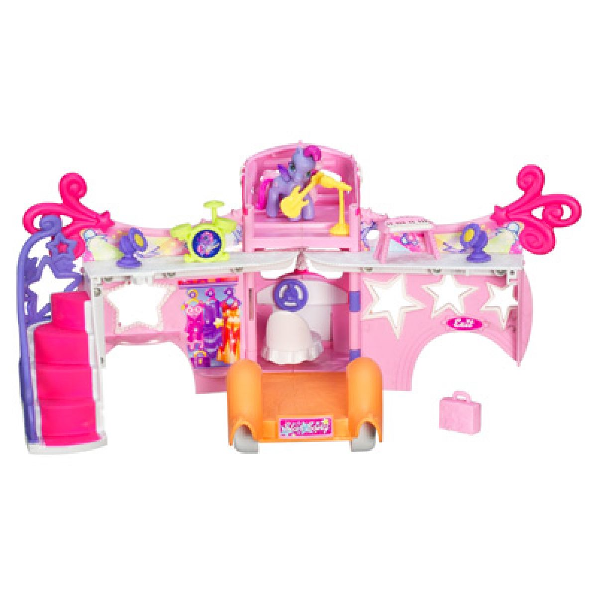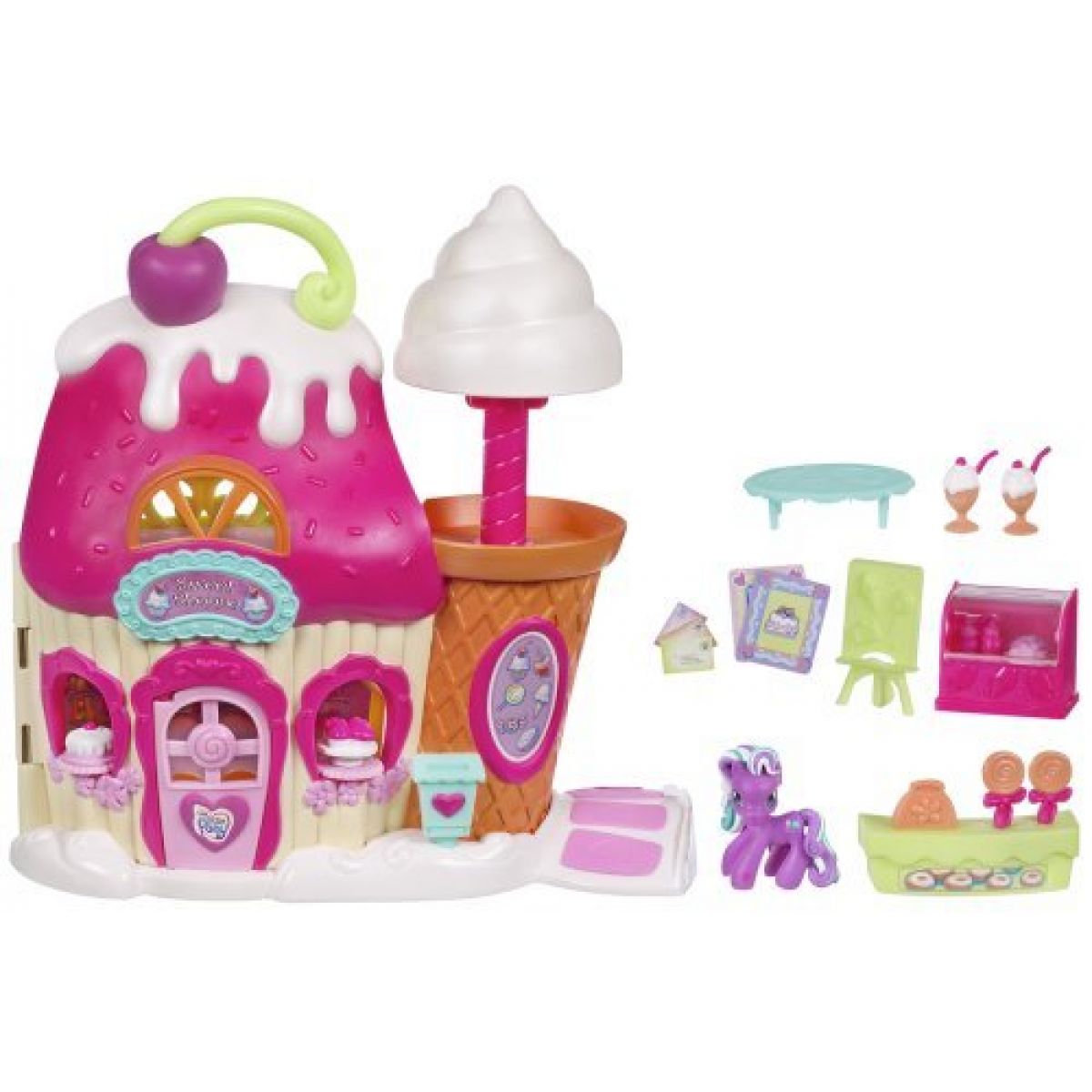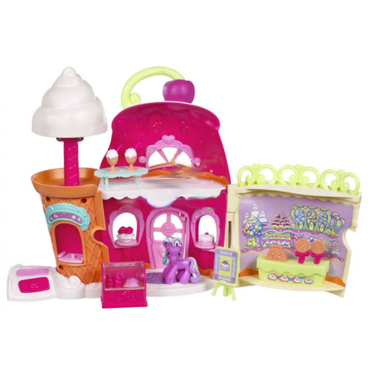 V domečcích u poníků je vždycky plno, protože v cukrárně nabízí ty nejsladší pochoutky ve městě. V domečku - Kabelka se poníci naparádí a ve žlutém domečku se poníci povozí na duze a pohoupou se na houpačce.