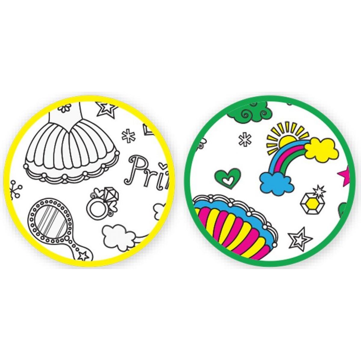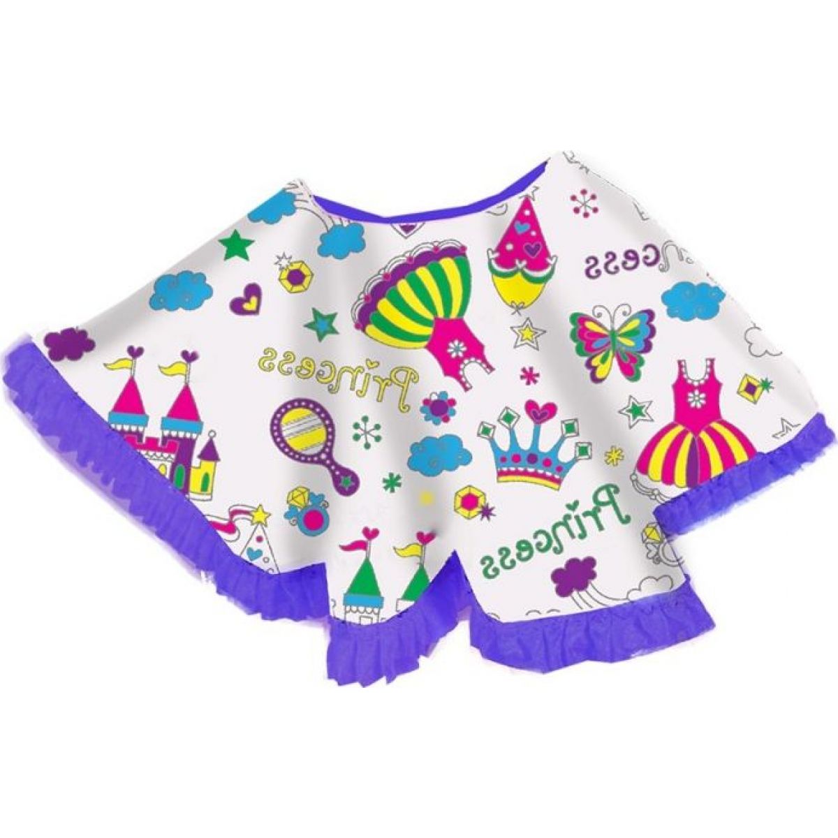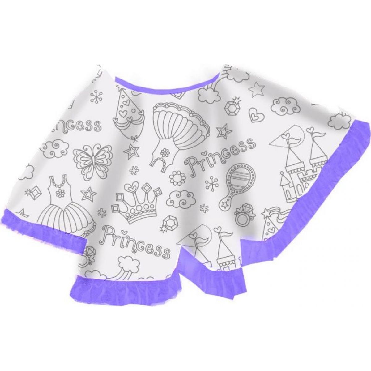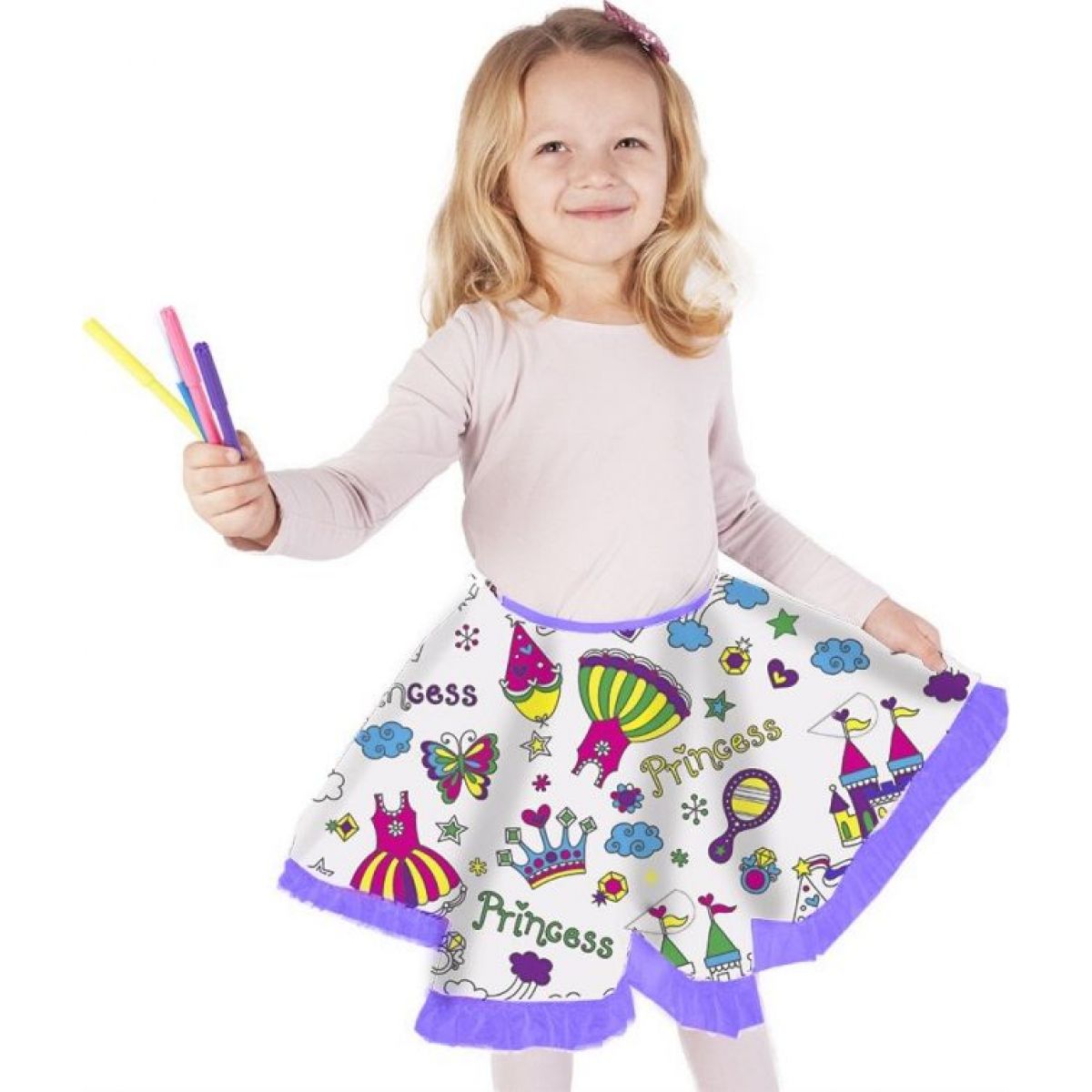 Bílá sukně s fialovým lemem je zdobená vzorem připraveným pouze v kontuře. Holčičky si mohou tyto vzory samy vybarvit. Sukně má pružný pas.