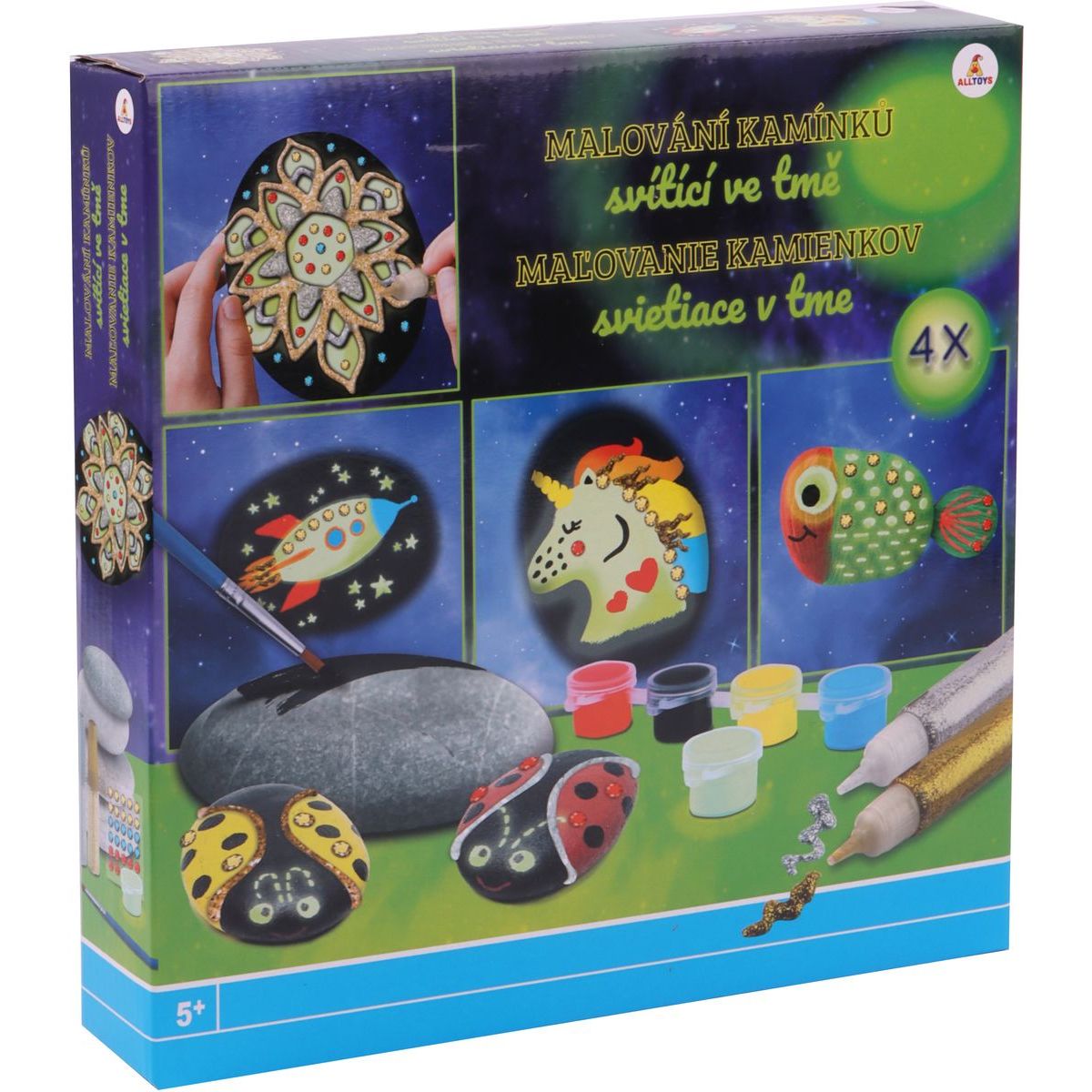 Kreatívna súprava ponúka deťom zdobenie kameňov, ktoré sú v tejto sade pripravené so svietiacimi farbami. Dievčatá a chlapci sa môžu inšpirovať námetmi z krabice alebo tiež tvoriť podľa svojej fantázie.