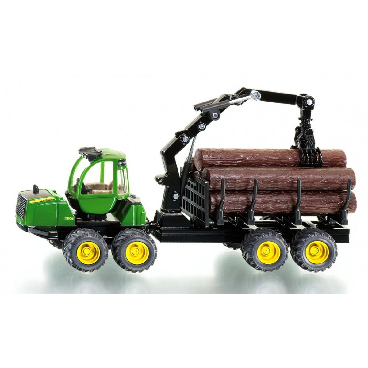 Lesní traktor John Deere se 4 -mi nápravami slouží ke svážení dřeva z hůře přístupných míst. Pohyblivé rameno s drapákem umožní snadnou nakládku a vykládku dřeva.