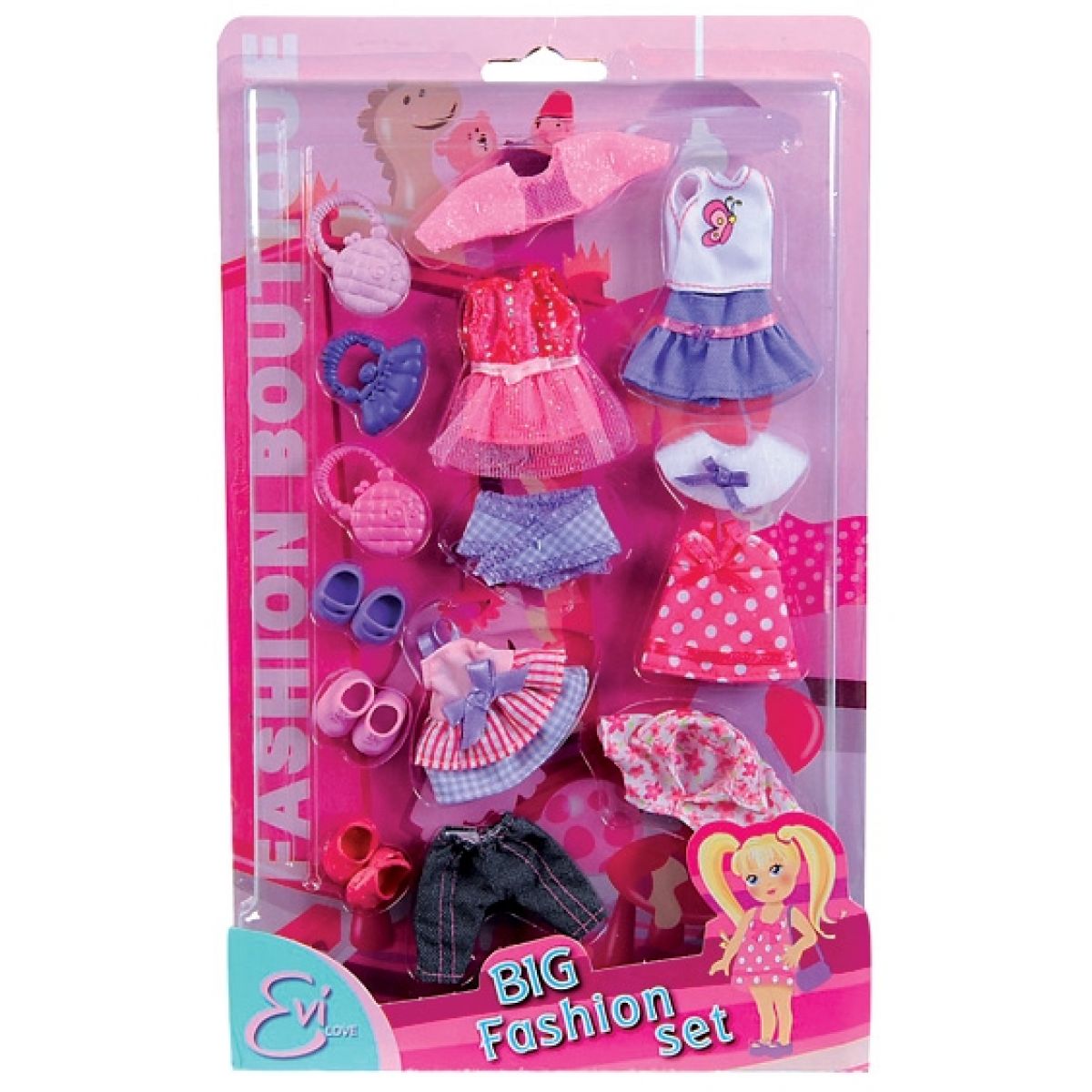 Velká sada oděvů pro Evičku zahrnuje různé šaty, boty a kabelky. Panenka není součástí! Celkem obsahuje 15 ks.