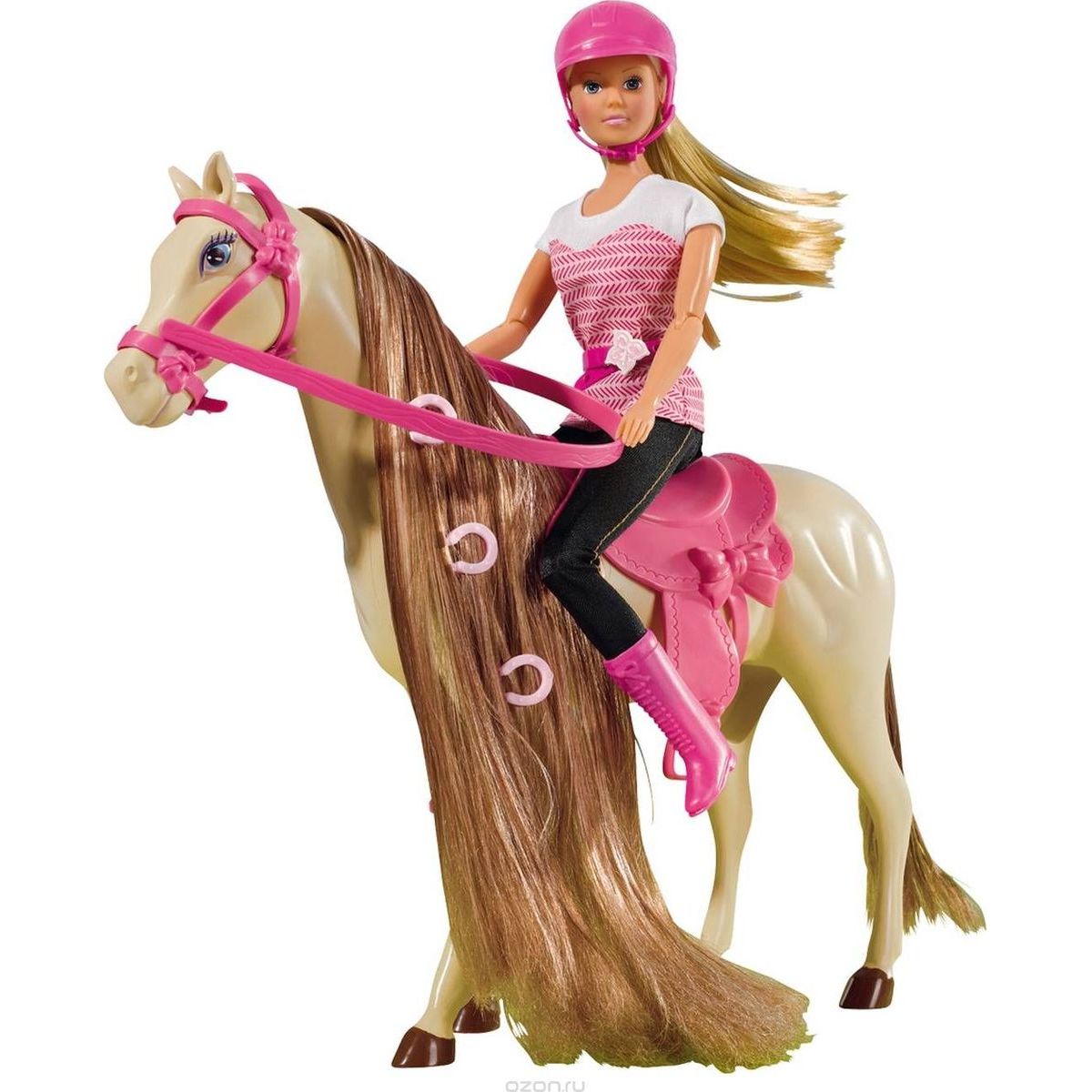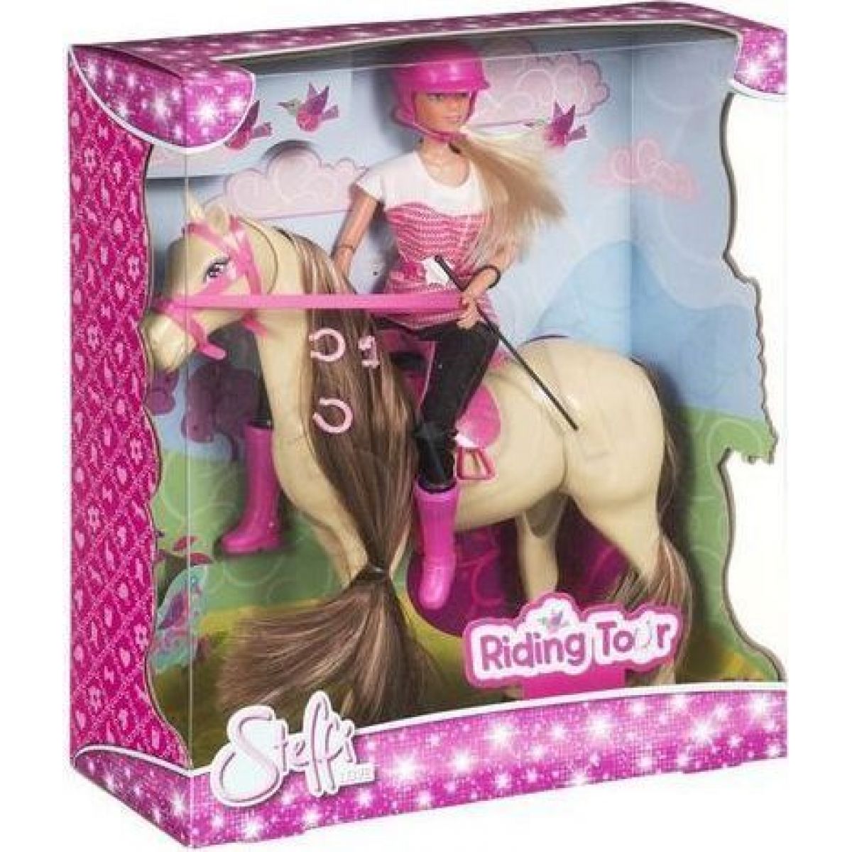 Panenka Steffi jako elegantní jezdkyně nasedla na svého bělouše s dlouhou hnědou hřívou a vyráží na projížďku. Koník je osedlaný růžovým sedlem a ohlávkou, má pohyblivé nohy. Steffi je připravena kdykoli k jízdě, má růžové vysoké jezdecké boty a růžovou žokejskou přilbu.