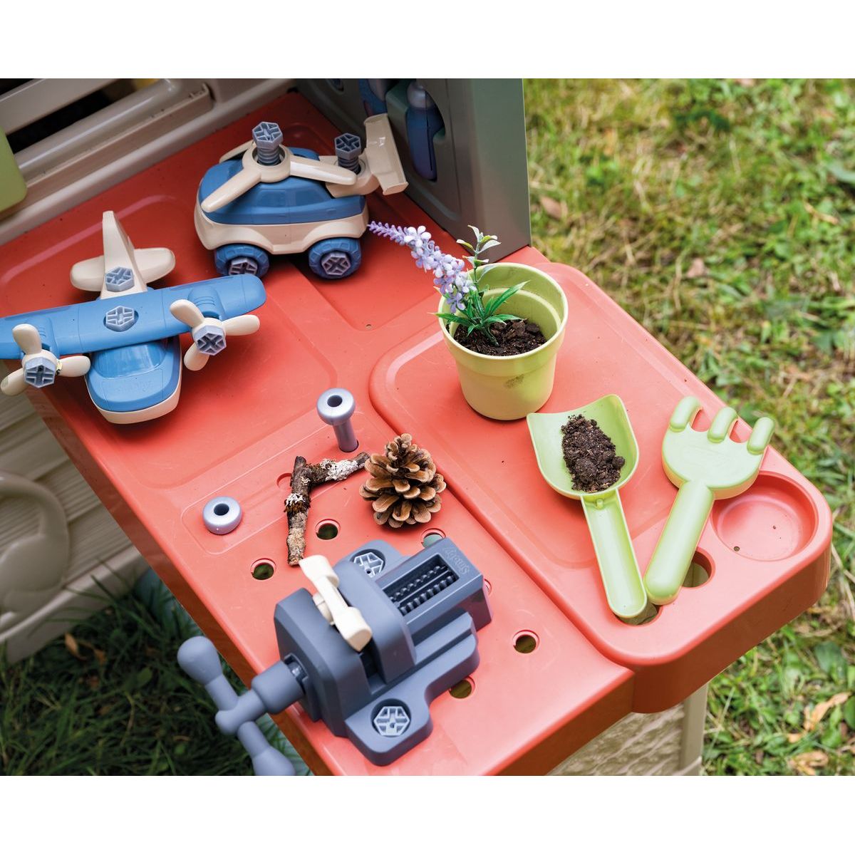 Domček má jedny dvere a dve okná so žalúziami, ku ktorým je pripevnená dielňa s veľkým pracovným stolom a boxami na náradie. V balení sa nachádza 39 doplnkov vrátane skrutkovača, kladiva či autíčka na zostavenie. Deti môžu trénovať zatĺkanie klincov do pracovnej dosky a rozvíjať tak svoje zručnosti hravou formou.