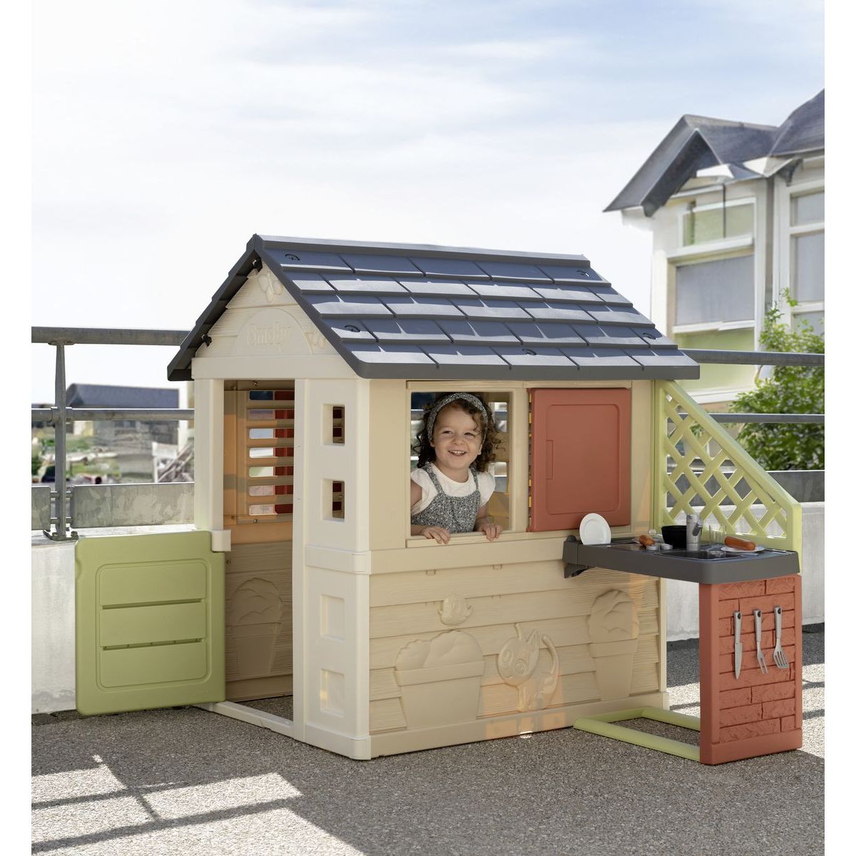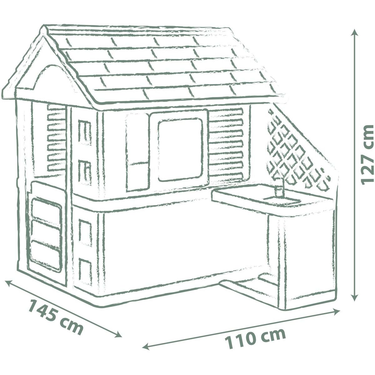 Tento stabilný a priestranný detský domček Smoby Life Nature ponúka skvelé herné možnosti. Vonkajšia kuchynka je vybavená nefunkčným drezom, varnou doskou, grilom a poličkou. Súčasťou sú aj poháre, taniere, kuchynské náčinie, klobásky a malý hrniec. Vďaka tyrkysovo-zelenej farebnej kombinácii a detailne prepracovaným stenám s motýľmi a mačičkou pôsobí domeček hravo a moderne. Vyrobený z UV odolného plastu, ktorý obsahuje minimálne 57 % recyklovaného materiálu.