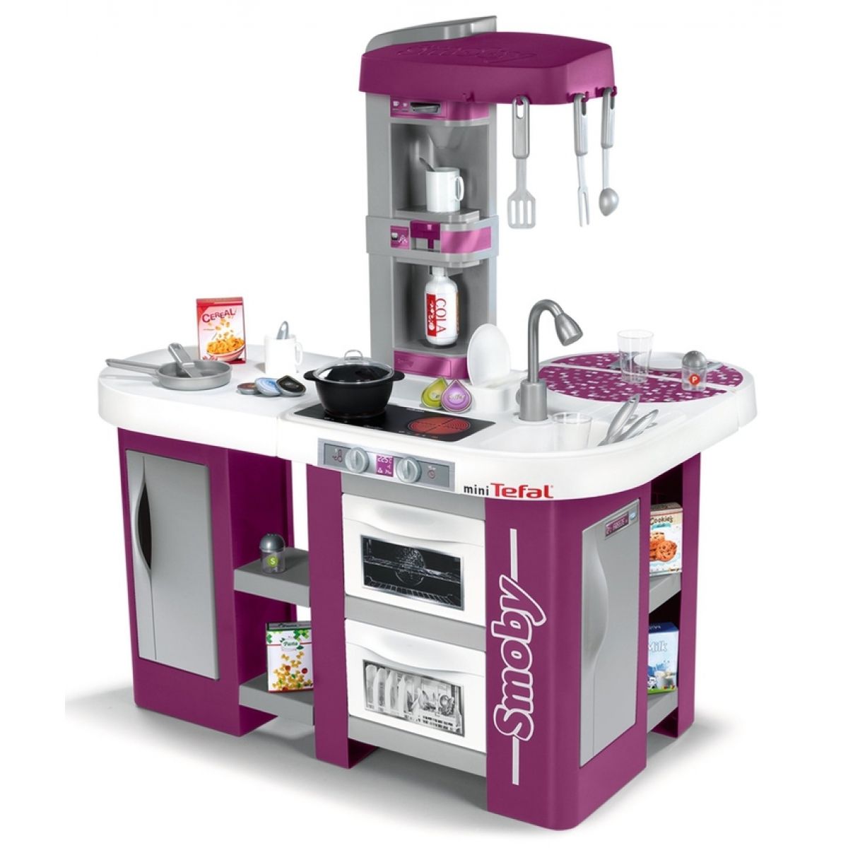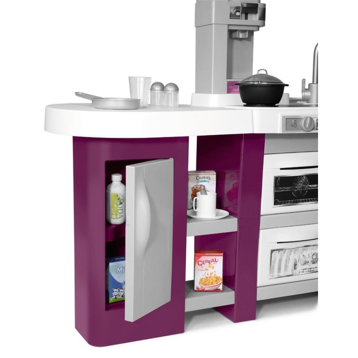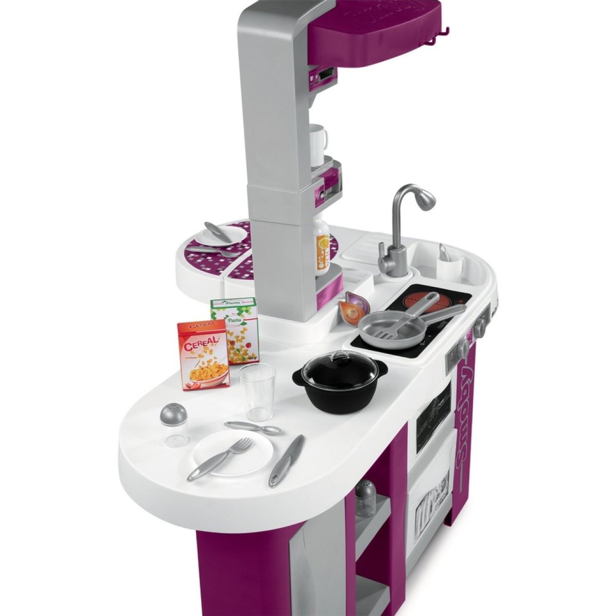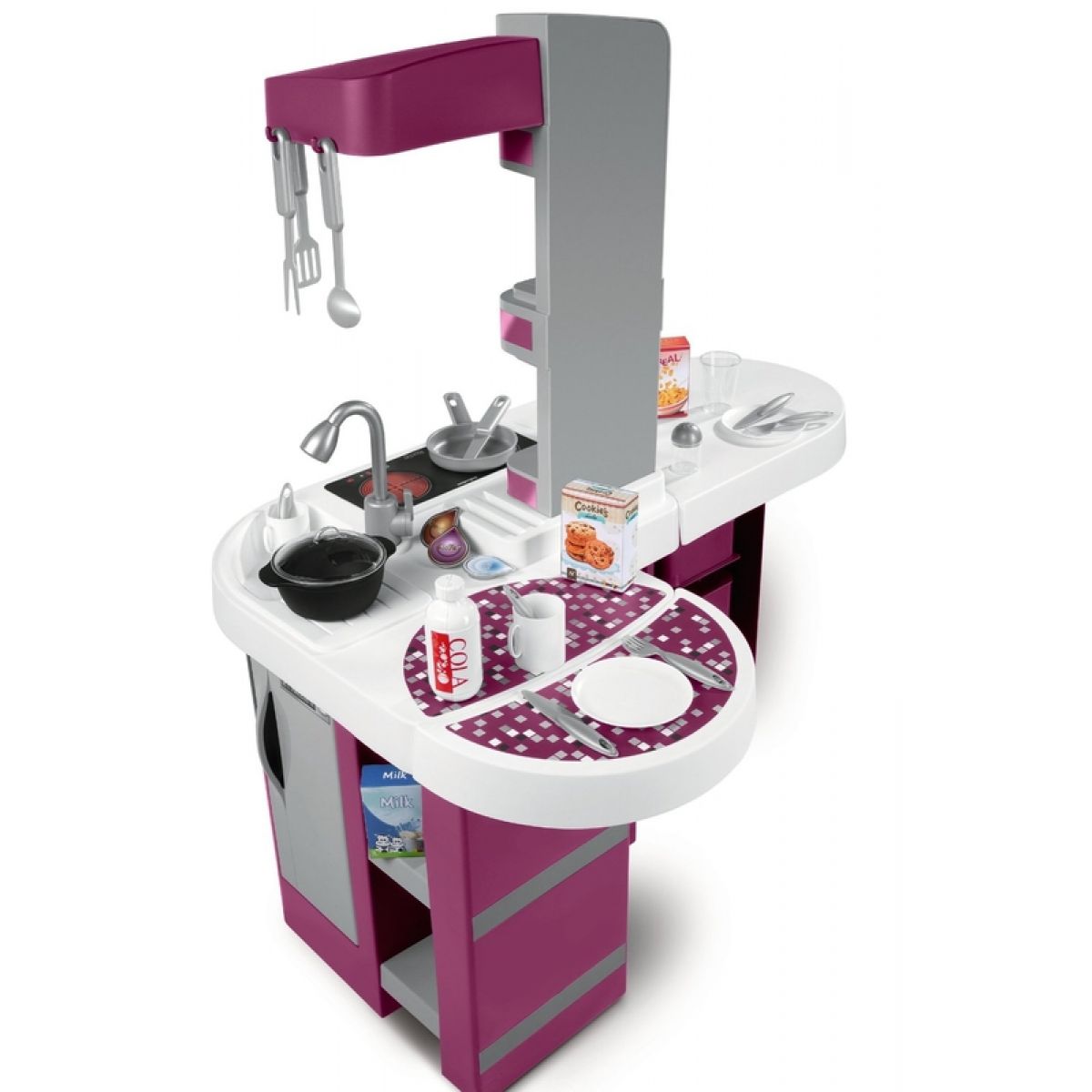 Velká plastová elektronická kuchyňka v moderních barvách obsahuje sporák se sklokeramickou deskou, digestoř, troubu, lednici, kávovar, výrobník na sodu, velkorysý úložný prostor a příslušenství v podobě nádobí, náčiní a atrap potravin. Kuchyňka vydává zvuky vaření.